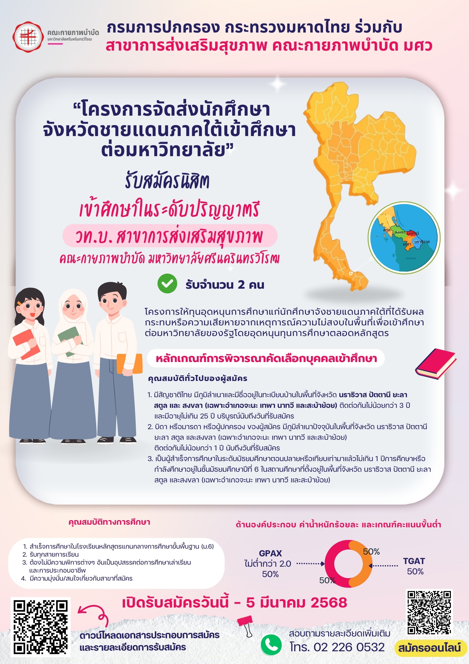 กรมการปกครอง กระทรวงมหาดไทย ร่วมกับ สาขาส่งเสริมสุขภาพ มศว เปิดรับสมัคร ผู้สนใจเข้าศึกษาต่อระดับปริญญาตรี