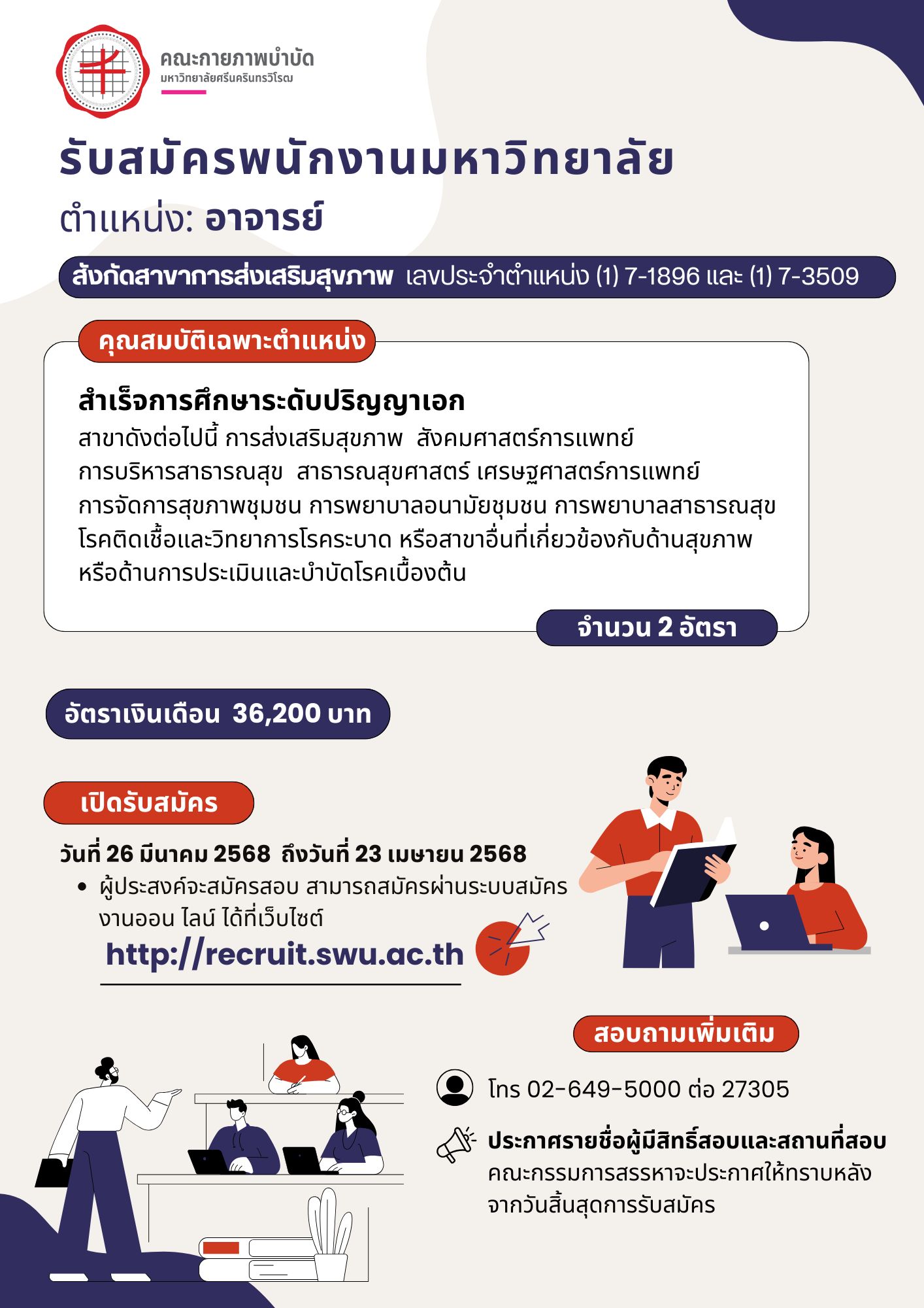 ผู้ประสงค์จะสมัครสอบ สามารถสมัครผ่านระบบสมัครงานออนไลน์ ได้ที่เว็บไซต์ http://recruit.swu.ac.th