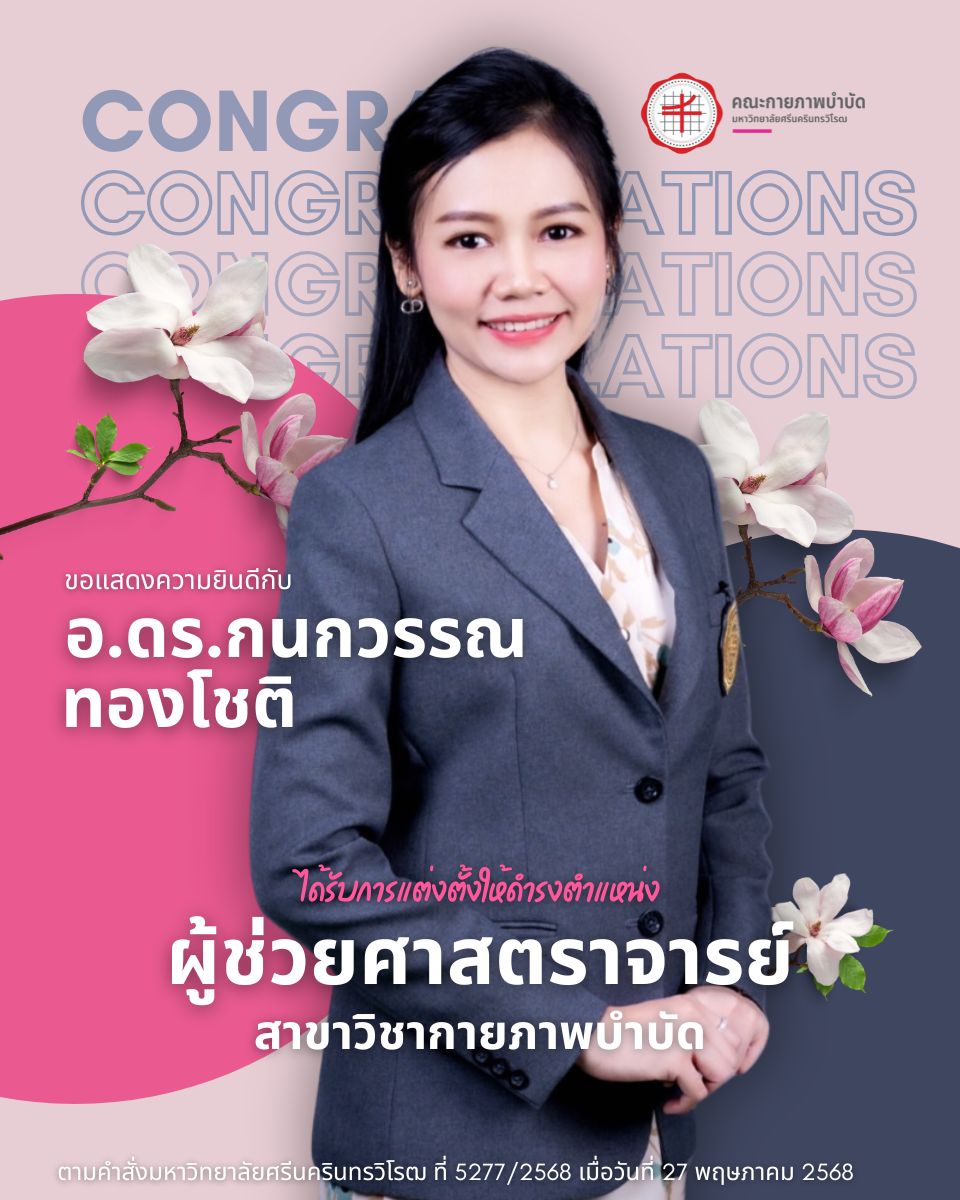 ข่าวประชาสัมพันธ์ คณะกายภาพบำบัด มศว ขอแสดงความยินดีกับผู้ช่วยศาสตราจารย์ ดร.กนกวรรณ ทองโชติในโอกาสได้รับแต่งตั้งให้ดำรงตำแหน่ง"ผู้ช่วยศาสตราจารย์" วันเริ่ม 2025-05-28