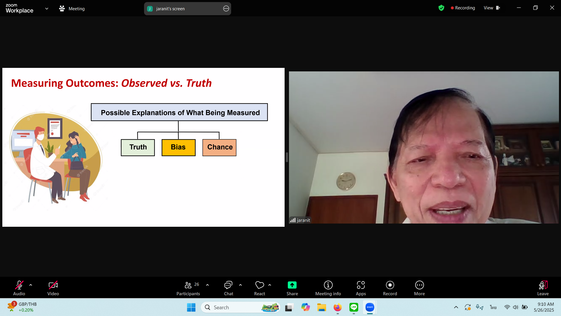 เมื่อวันที่ 26 พฤษภาคม 2568 คณะกายภาพบำบัด มศว จัดโครงการคลินิกวิจัย รูปแบบออนไลน์ ผ่านระบบ Zoom Meeting เพื่อให้อาจารย์และนิสิตบัณฑิตศึกษา มีความรู้ความเข้าใจในการออกแบบงานวิจัย และสถิติที่เหมาะสมที่ใช้ในงานวิจัย โดยได้รับเกียรติจาก รศ.ดร.จรณิต แก้วกังวาน สังกัดศูนย์ความเป็นเลิศทางสารสนเทศศาสตร์ชีวเวชและสาธารณสุข (BIOPHICS) คณะเวชศาสตร์เขตร้อน มหาวิทยาลัยมหิดล เป็นวิทยากรบรรยายในครั้งนี้