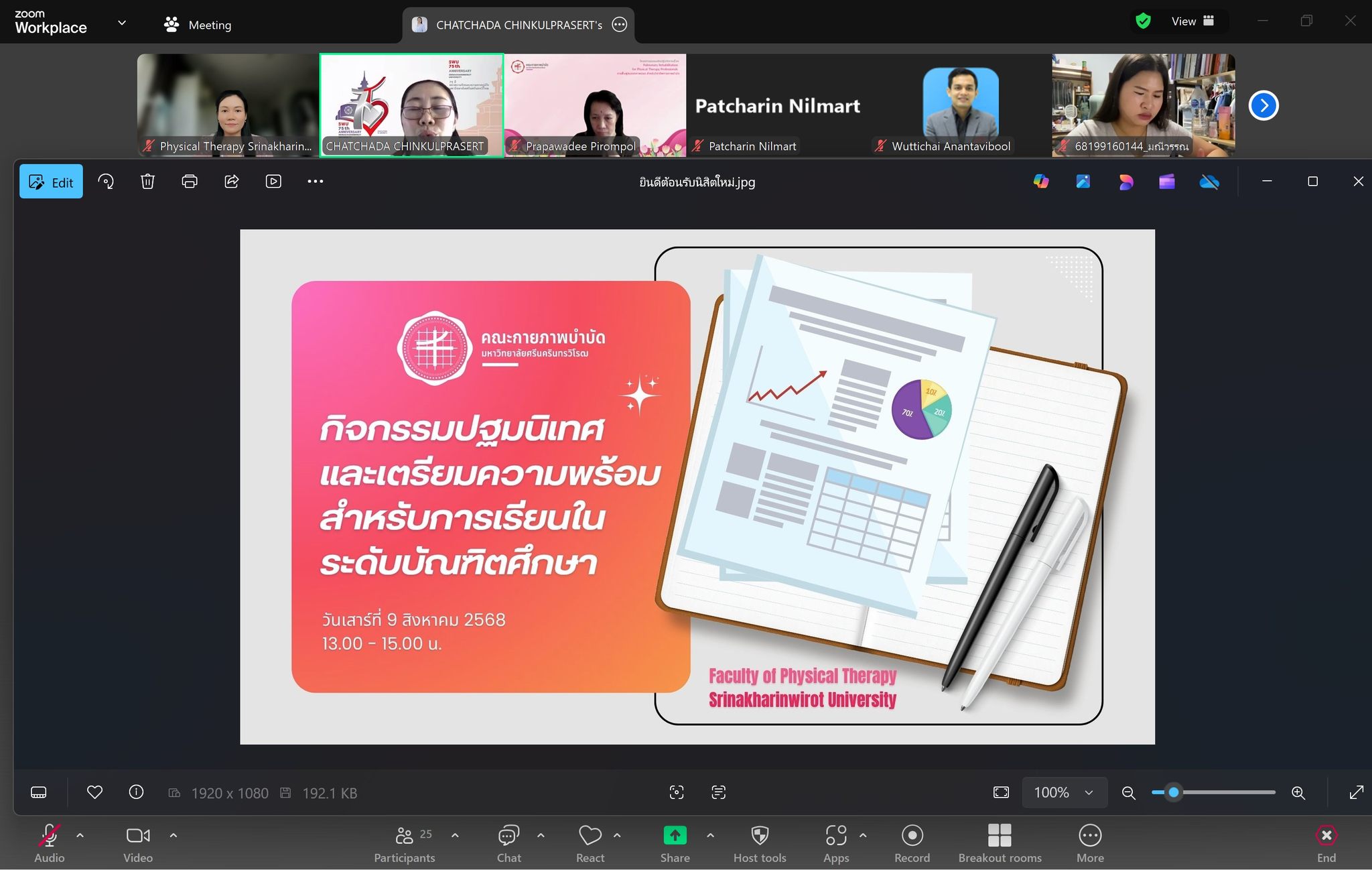 กิจกรรม หลักสูตรบัณฑิตศึกษา สาขากายภาพบำบัด คณะกายภาพบำบัด มศว จัดกิจกรรมปฐมนิเทศและเตรียมความพร้อมสำหรับการเรียนในระดับบัณฑิตศึกษา เมื่อวันเสาร์ที่ 9 สิงหาคม 2568 รูปแบบ Online ผ่าน Zoom วันเริ่ม 2025-08-09 PreviousNext