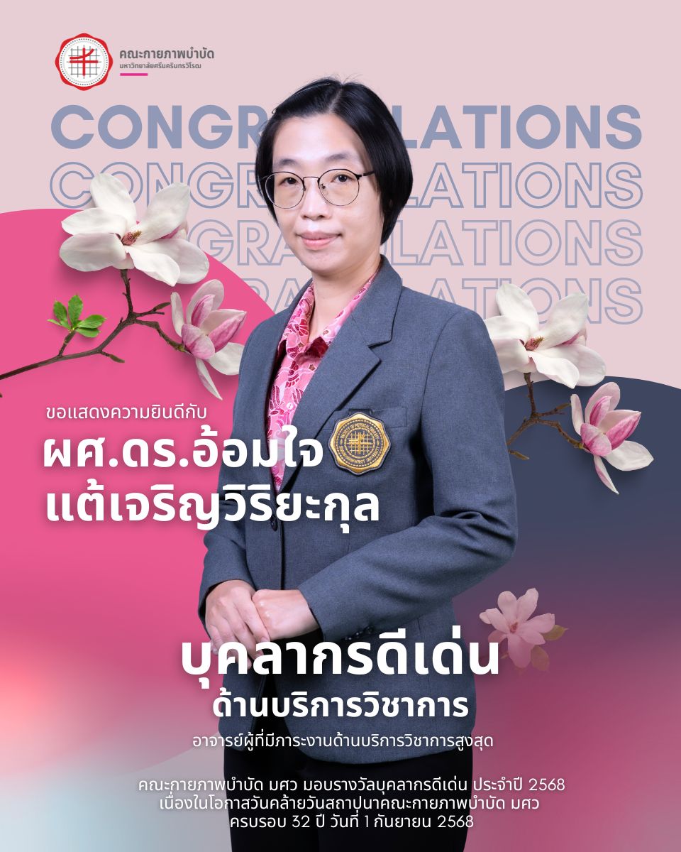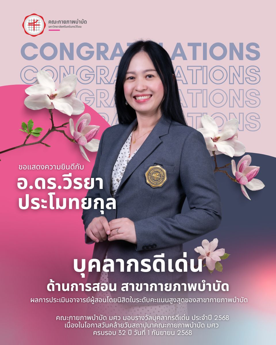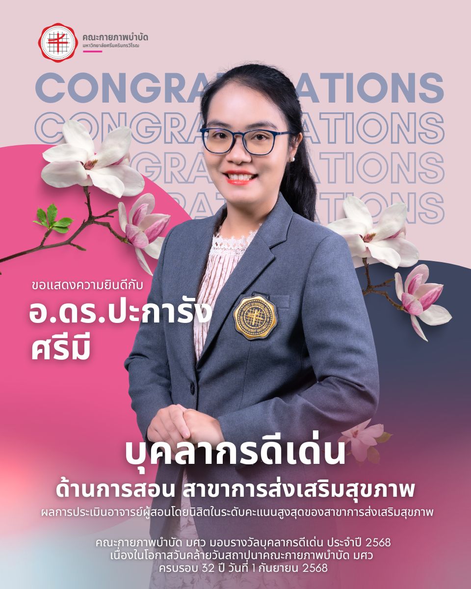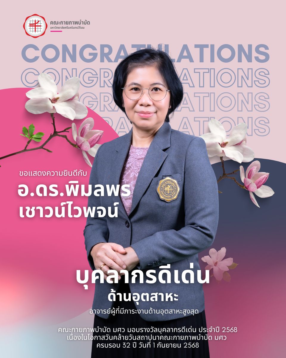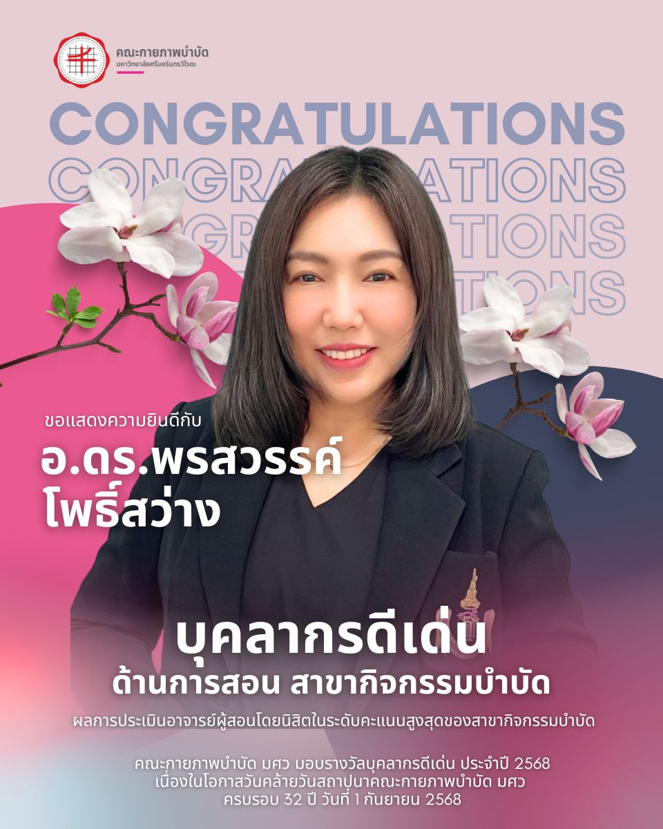 ข่าวประชาสัมพันธ์ เนื่องในโอกาสวันคล้ายวันสถาปนาคณะกายภาพบำบัด มศวครบรอบ 32 ปี ในวันที่ 1 กันยายน 2568คณะกายภาพบำบัด มศว มอบรางวัลบุคลากรดีเด่น ประจำปี 2568- ด้านการสอน- ด้านอุตสาหะ- ด้านบริการวิชาการ- ด้านนวัตกรรมขอแสดงความยินดีกับบุคลากรทุกท่านมา ณ โอกาสนี้ PreviousNext