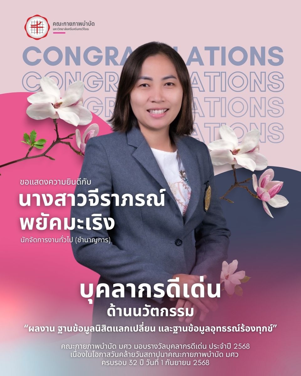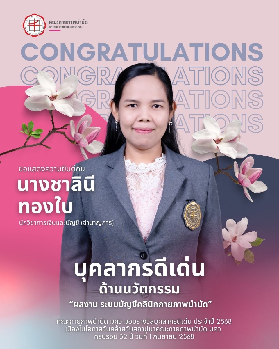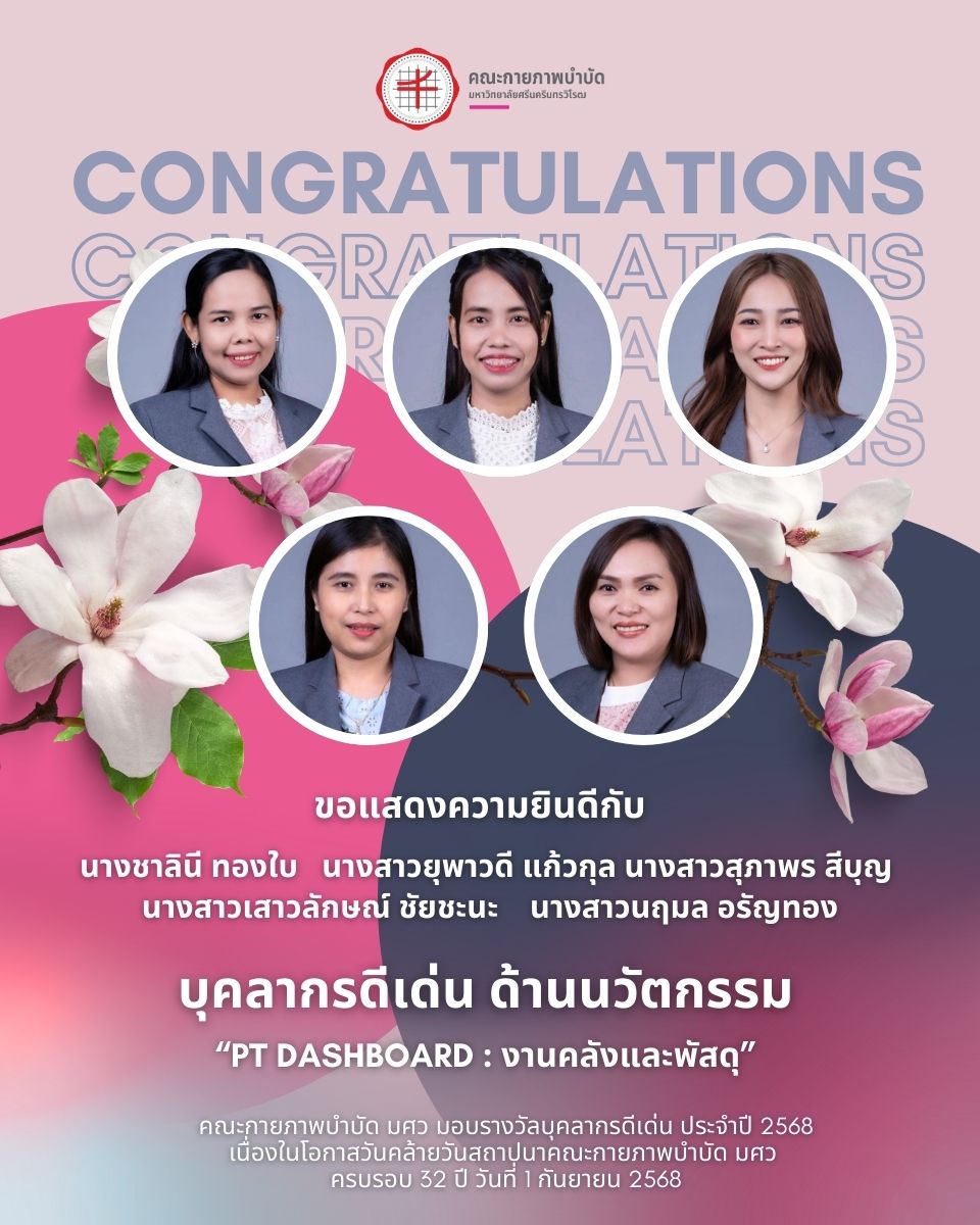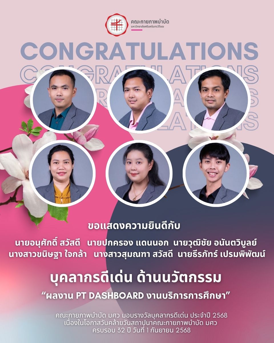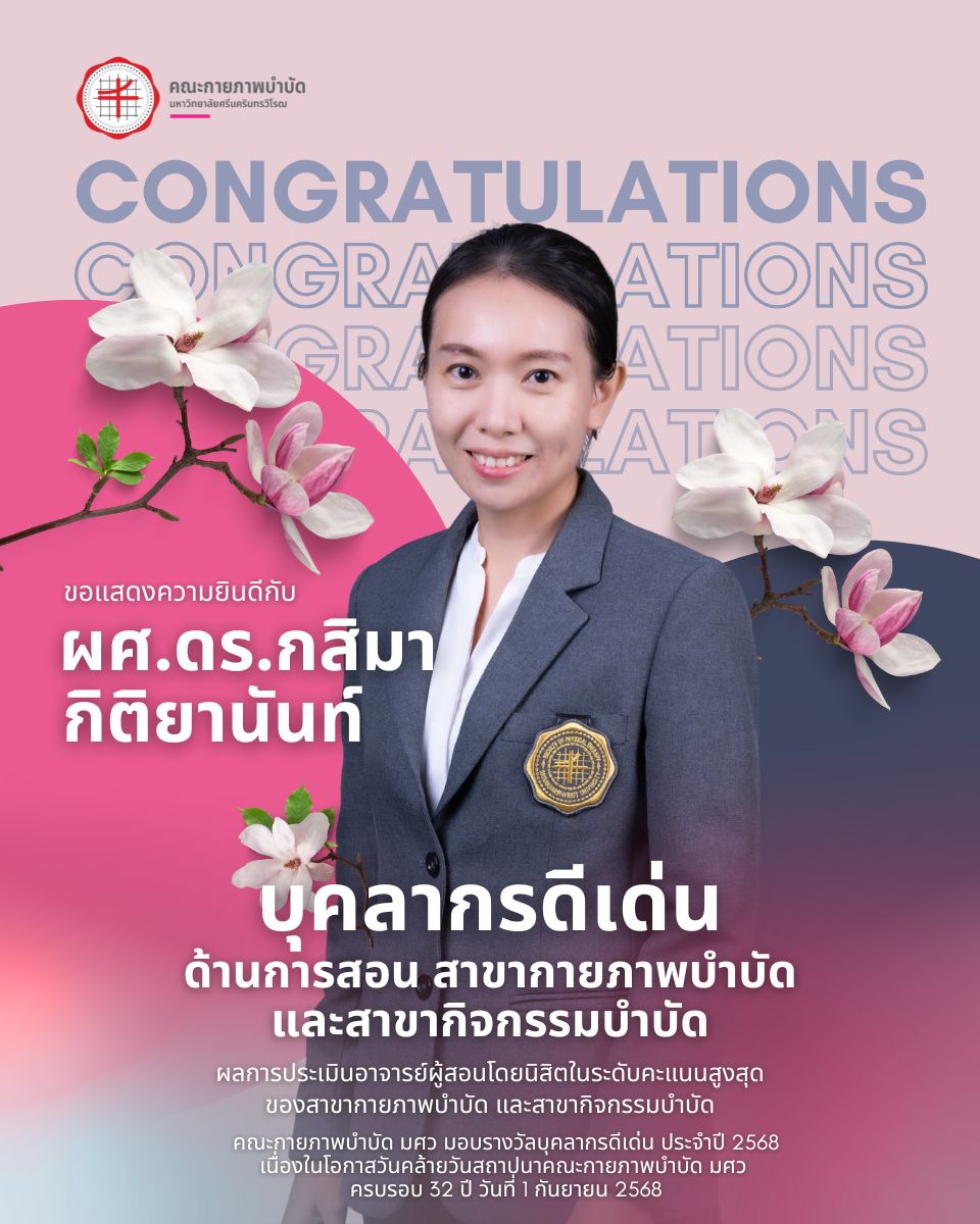 ข่าวประชาสัมพันธ์ เนื่องในโอกาสวันคล้ายวันสถาปนาคณะกายภาพบำบัด มศวครบรอบ 32 ปี ในวันที่ 1 กันยายน 2568คณะกายภาพบำบัด มศว มอบรางวัลบุคลากรดีเด่น ประจำปี 2568- ด้านการสอน- ด้านอุตสาหะ- ด้านบริการวิชาการ- ด้านนวัตกรรมขอแสดงความยินดีกับบุคลากรทุกท่านมา ณ โอกาสนี้ PreviousNext