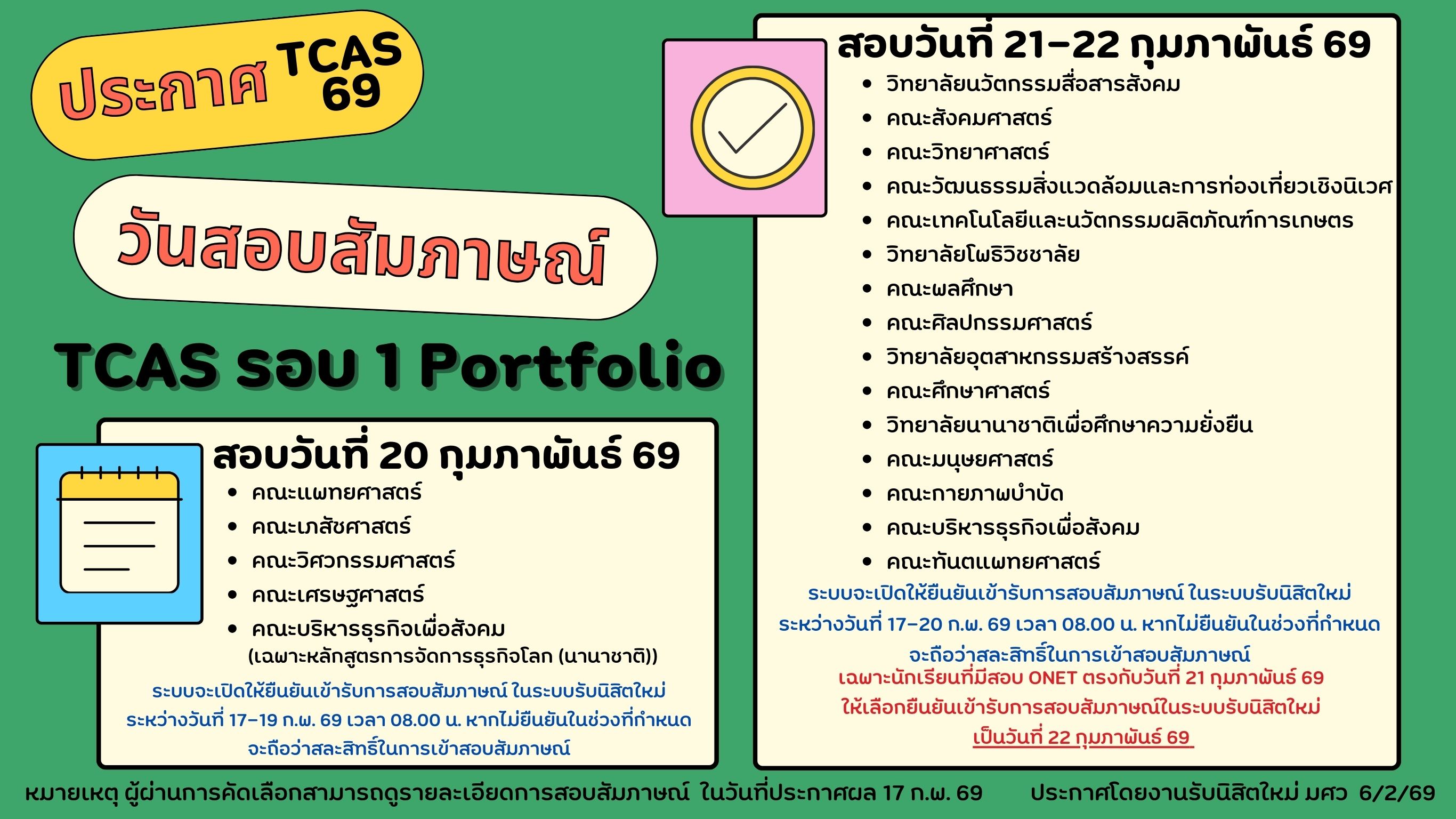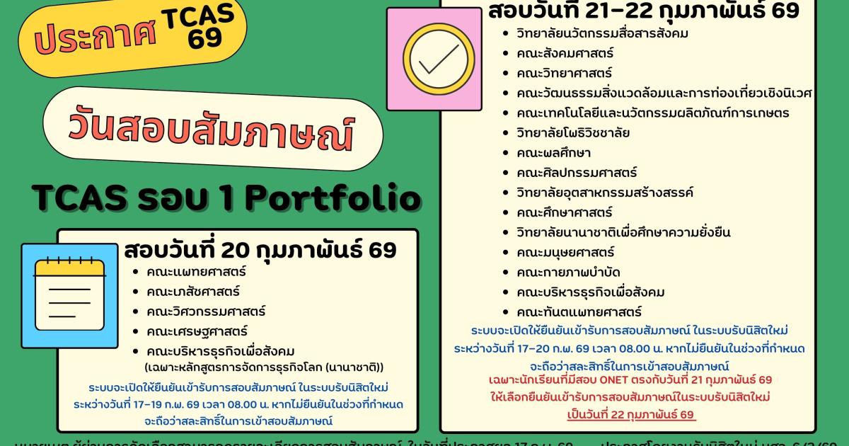 ประกาศกำหนดการสอบสัมภาษณ์ TCAS 69 รอบที่ 1 (Portfolio)