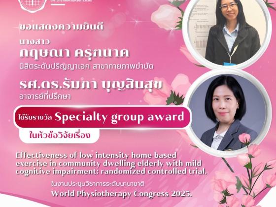 คณะกายภาพบำบัด มศว ขอแสดงความยินดีกับนางสาว สุมาลัย คล้ายเนียมนิสิตปริญญาโท สาขากายภาพบำบัดได้นำผลงานวิจัยไปต่อยอดในงานประจำและได้รับรางวัลชนะเลิศ…