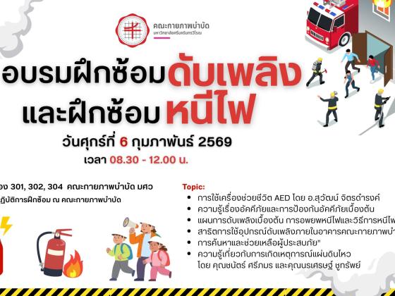 คณะกายภาพบำบัด มศว จัดโครงการอบรมฝึกซ้อมดับเพลิง และฝึกซ้อมหนีไฟ ประจำปี 2569 ในวันที่ 6 กุมภาพันธ์ 2569 ณ ห้อง 301, 302, 304 และอาคารคณะกายภาพบำบัด…