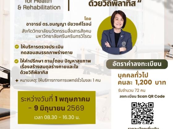 ขอเชิญผู้สนใจเข้าร่วมโครงการ "สร้างสมดุลร่างกายและใจ ด้วยวิถีพิลาทิส"ให้บริการตรวจประเมิน ทดสอบสมรรถภาพร่างกายให้คำปรึกษา ถามตอบ ปัญหาสุขภาพ…