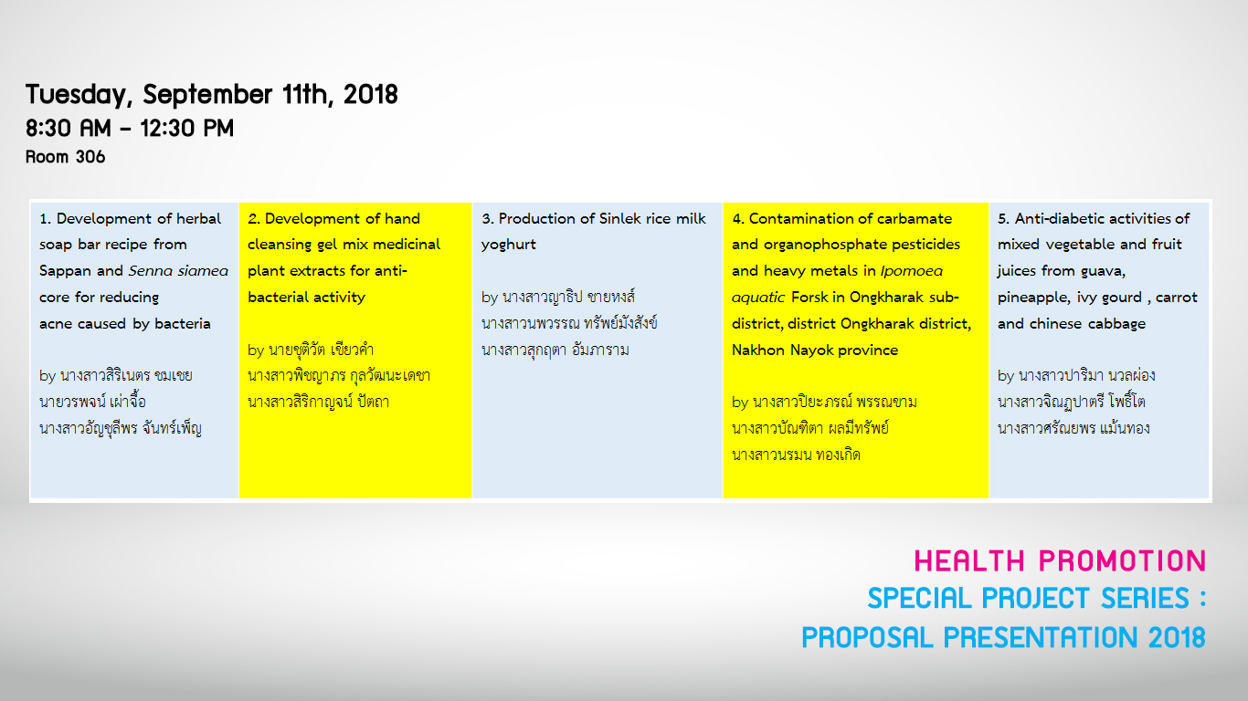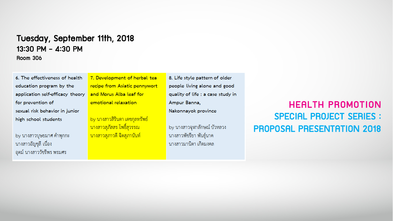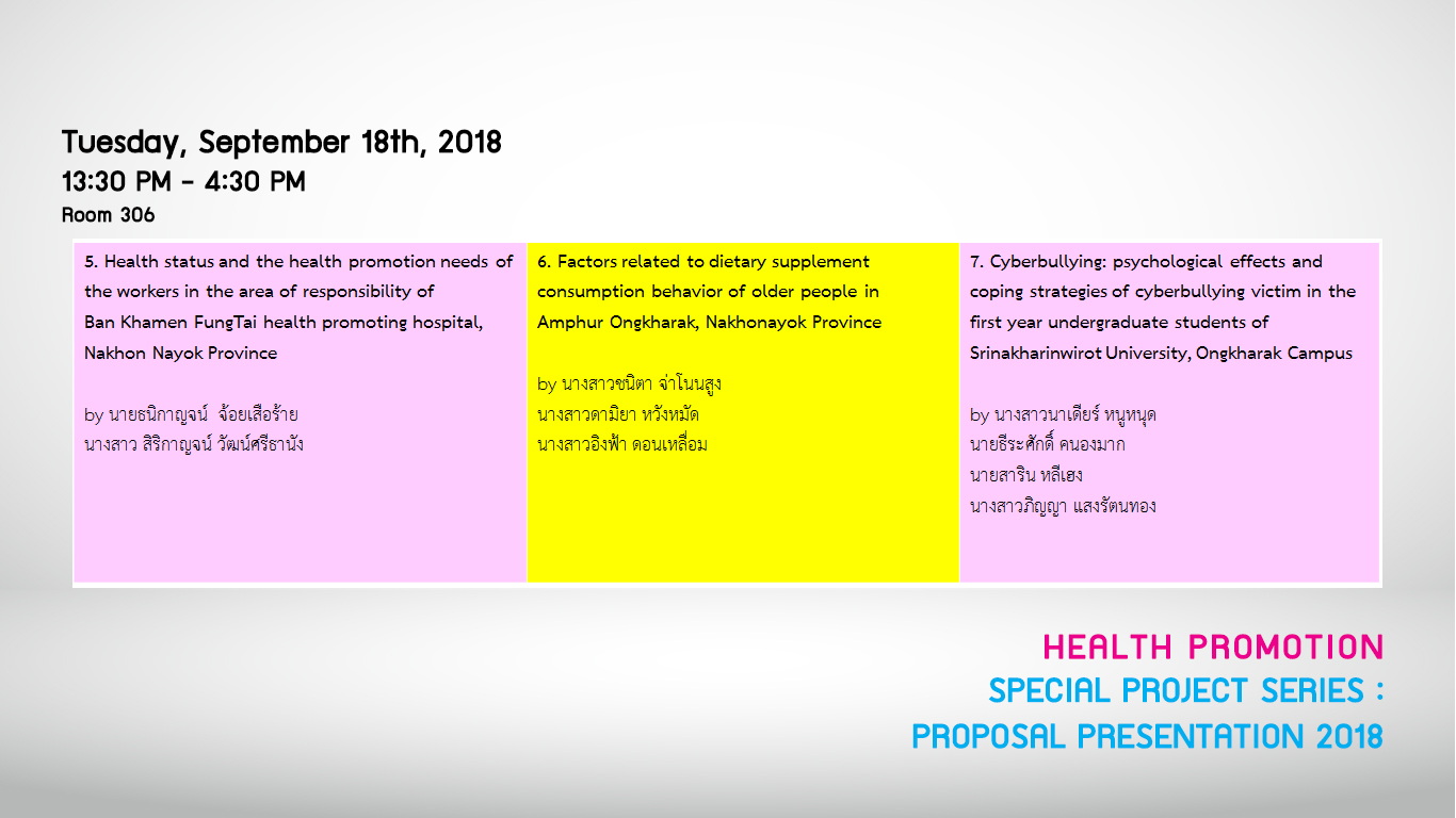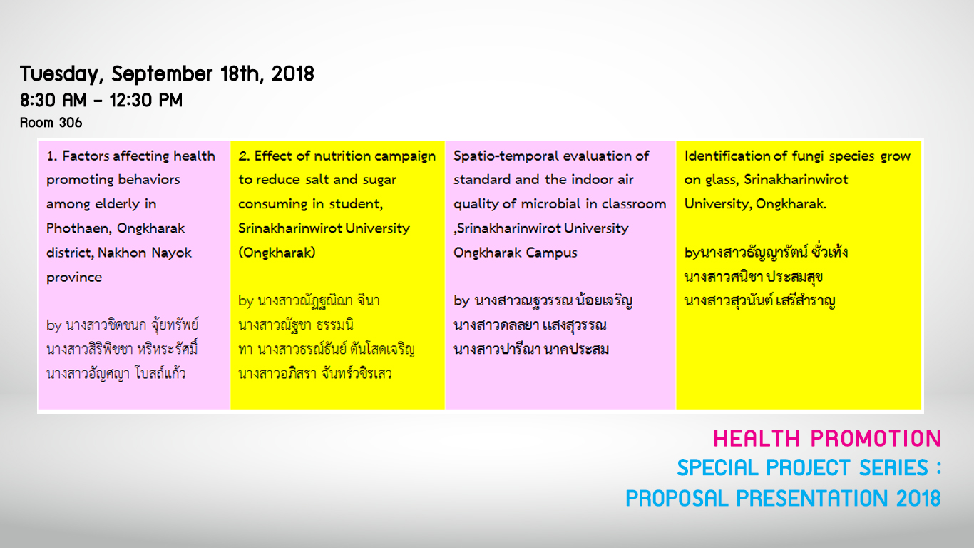 ขอเชิญนิสิตสาขาการส่งเสริมสุขภาพ ปี 1- 3 เข้าฟังการนำเสนอผลงานวิจัยของนิสิตสาขาการส่งเสริมสุขภาพ ชั้นปีที่ 4 ในวันที่ 11,18 กันยายน 2561 ณ คณะกายภาพบำบัด มศว ห้อง 306 เวลา 08.30 - 16.30 น.