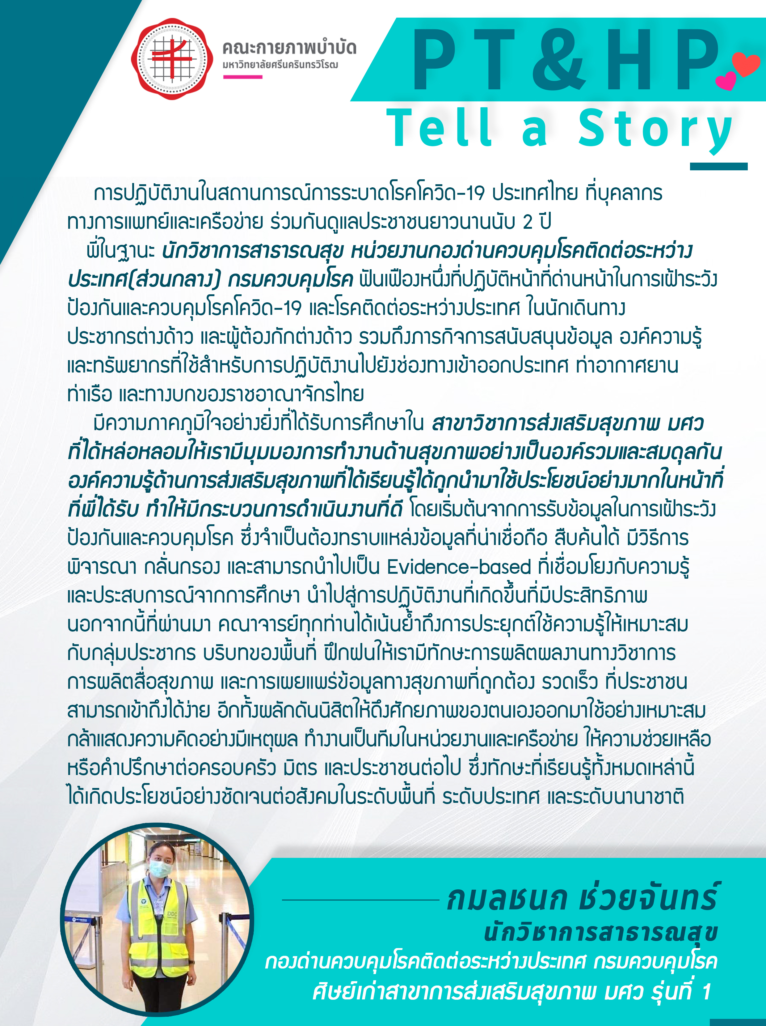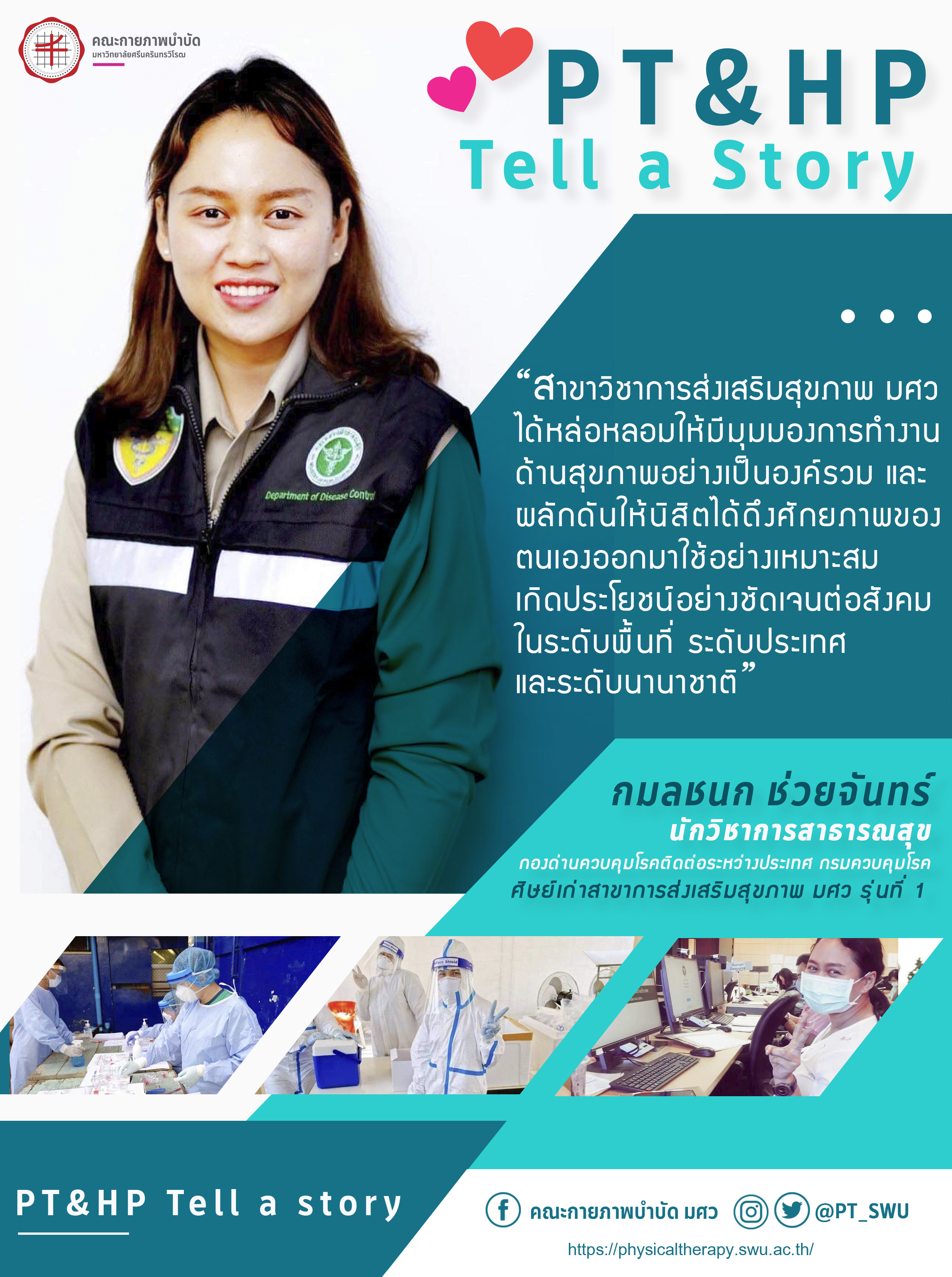 มีความภาคภูมิใจอย่างยิ่งที่ได้รับการศึกษาใน สาขาวิชาการส่งเสริมสุขภาพ มศว ที่ได้หล่อหลอมให้เรามีมุมมองการทำงานด้านสุขภาพอย่างเป็นองค์รวมและสมดุลกัน องค์ความรู้ด้านการส่งเสริมสุขภาพที่ได้เรียนรู้ได้ถูกนำมาใช้ประโยชน์อย่างมากในหน้าที่ที่พี่ได้รับ ทำให้มีกระบวนการดำเนินงานที่ดี โดยเริ่มต้นจากการรับข้อมูลในการเฝ้าระวัง ป้องกันและควบคุมโรค ซึ่งจำเป็นต้องทราบแหล่งข้อมูลที่น่าเชื่อถือ สืบค้นได้ มีวิธีการพิจารณา กลั่นกรอง และสามารถนำไปเป็น Evidence-based ที่เชื่อมโยงกับความรู้และประสบการณ์จากการศึกษา นำไปสู่การปฏิบัติงานที่เกิดขึ้นที่มีประสิทธิภาพ นอกจากนี้ที่ผ่านมา คณาจารย์ทุกท่านได้เน้นย้ำถึงการประยุกต์ใช้ความรู้ให้เหมาะสมกับกลุ่มประชากร บริบทของพื้นที่ ฝึกฝนให้เรามีทักษะการผลิตผลงานทางวิชาการ การผลิตสื่อสุขภาพ และการเผยแพร่ข้อมูลทางสุขภาพที่ถูกต้อง รวดเร็ว ที่ประชาชนสามารถเข้าถึงได้ง่าย อีกทั้งผลักดันนิสิตให้ดึงศักยภาพของตนเองออกมาใช้อย่างเหมาะสม กล้าแสดงความคิดอย่างมีเหตุผล ทำงานเป็นทีมในหน่วยงานและเครือข่าย ให้ความช่วยเหลือหรือคำปรึกษาต่อครอบครัว มิตร และประชาชนต่อไป ซึ่งทักษะที่เรียนรู้ทั้งหมดเหล่านี้ได้เกิดประโยชน์อย่างชัดเจนต่อสังคมในระดับพื้นที่ ระดับประเทศ และระดับนานาชาติ