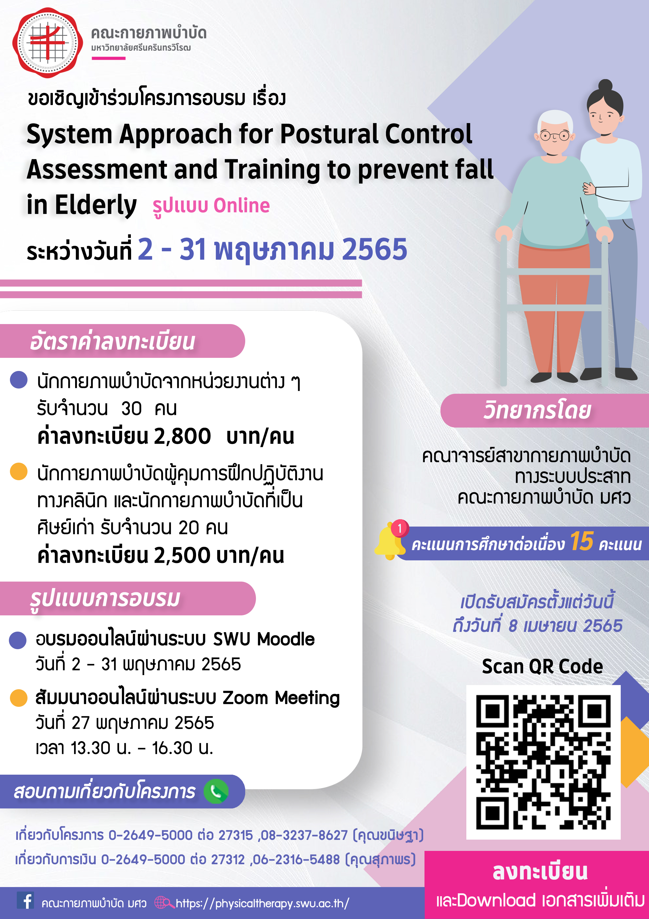 คณะกายภาพบำบัด มศว ขอเชิญนักกายภาพบำบัด อาจารย์ จากสถาบันต่างๆ เข้าร่วม โครงการอบรม System Approach for Postural Control Assessment and Training to prevent fall in elderly