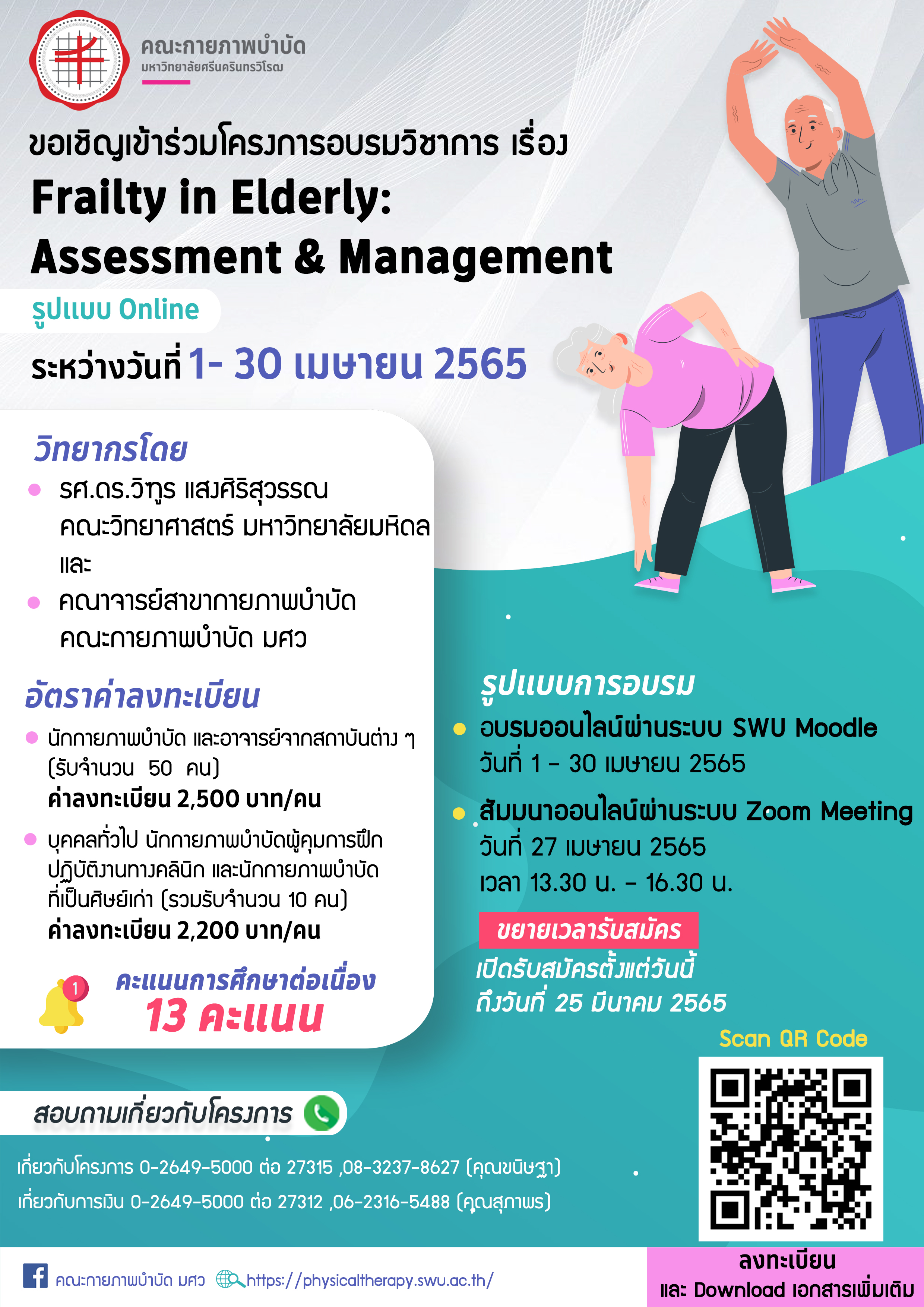 คณะกายภาพบำบัด มศว ขอเชิญนักกายภาพบำบัด อาจารย์ จากสถาบันต่างๆ เข้าร่วม โครงการอบรม Frailty in elderly: assessment & management