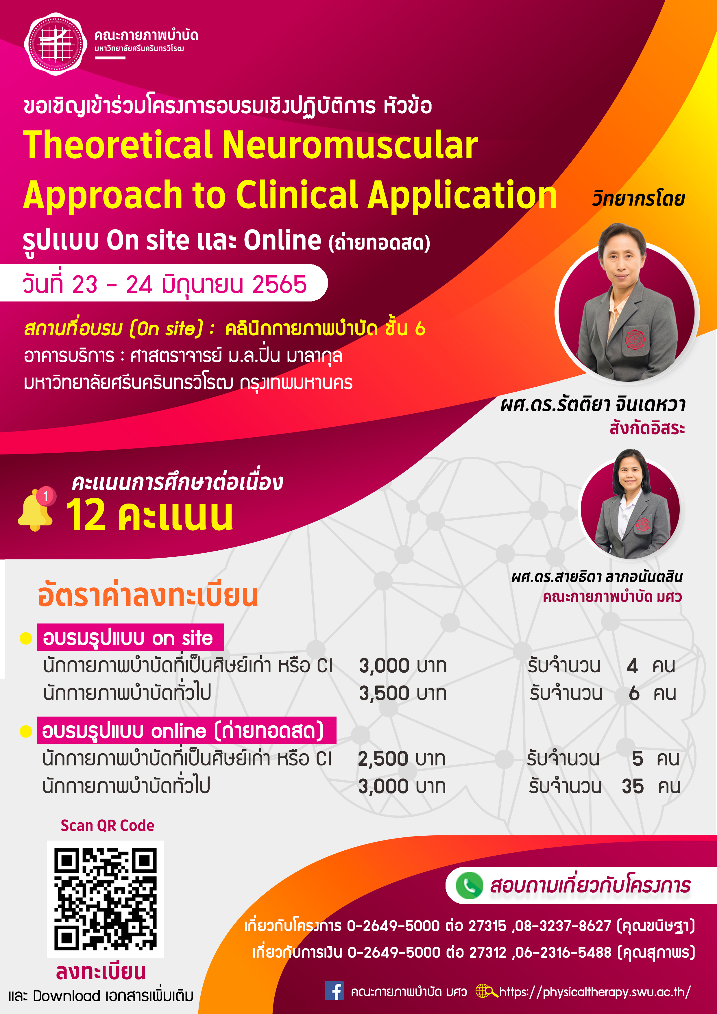 คณะกายภาพบำบัด มศว ขอเชิญนักกายภาพบำบัด อาจารย์ จากสถาบันต่างๆ เข้าร่วม โครงการอบรมเชิงปฏิบัติการ หัวข้อ “Theoretical neuromuscular approach to clinical application”