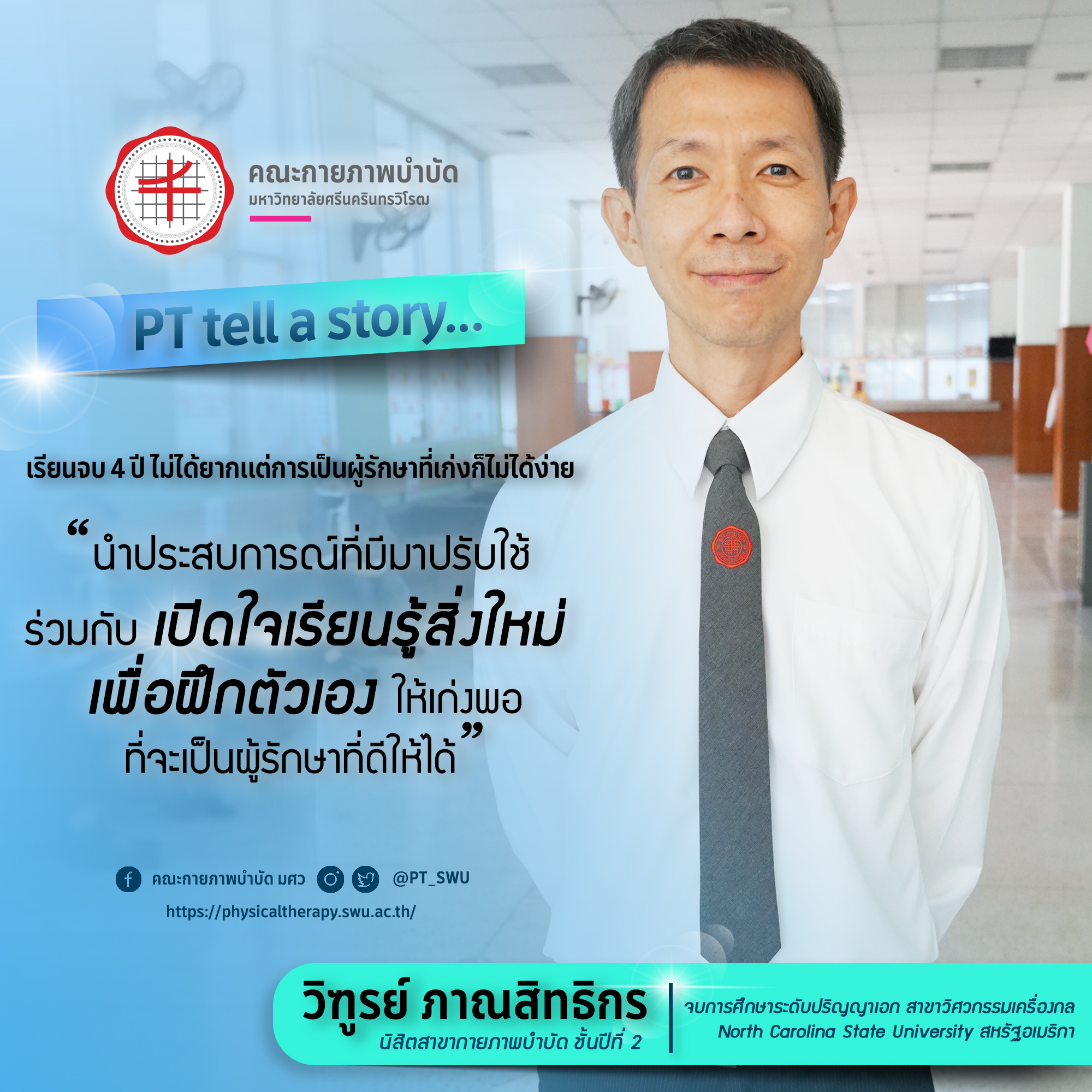 .....สวัสดีครับ ผมชื่อนายวิฑูรย์ ภาณสิทธิกร เป็นนิสิตชั้นปีที่ 2 สาขากายภาพบำบัด คณะกายภาพบำบัด มหาวิทยาลัยศรีนครินทรวิโรฒ อายุปีนี้ก็เข้ารอบที่ 4 แล้วครับ (เขินเลย) จบการศึกษาระดับปริญญาเอก สาขาวิศวกรรมเครื่องกล ที่ North Carolina State University สหรัฐอเมริกา เคยทำงานในแผนกวิศวกรรม วิเคราะห์หาสาเหตุของปัญหาในอุปกรณ์สื่อสารทางแสงครับ ในช่วงทำงานก็สนุกกับการหาต้นต่อของปัญหาจนไม่ได้ดูแลสุขภาพตัวเอง ผลของการนั่งต่อเนื่องกันเป็นเวลานาน ๆ ทำให้วันหนึ่งแค่ก้มลงไปผูกเชือกรองเท้า ก็ถึงกับมีอาการปวดหลังร้าวลงขา ทำให้ได้คิดขึ้นมาว่าที่ผ่านมา ผมรู้วิธีการแก้ไขปัญหาสิ่งต่าง ๆ แต่กลับไม่รู้อะไรเกี่ยวกับร่างกายตัวเองเลยสักนิด จึงเป็นจุดเริ่มต้นให้สนใจในวิทยาศาสตร์สุขภาพอย่างจริงจังครับ ลองค้นหาดู กะว่าอาจจะมีหลักสูตรระยะสั้นสำหรับผู้ที่จบปริญญาตรีแล้ว จนได้มาเห็นประกาศจากทางคณะกายภาพบำบัด มศว ซึ่งเป็นปีแรกที่เปิดรับสมัครให้คนทั่วไปที่ต้องการศึกษาต่อได้เข้าร่วมโครงการ ในขณะนั้นผมเองก็ไม่มีภาระอะไร จึงไม่รอช้า รีบสมัครขอรับโอกาสนั้นทันที