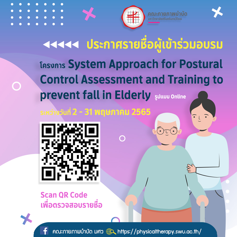 ประกาศรายชื่อผู้เข้าร่วมอบรมโครงการ System Approach for Postural Control Assessment and Training to prevent fall in Elderly