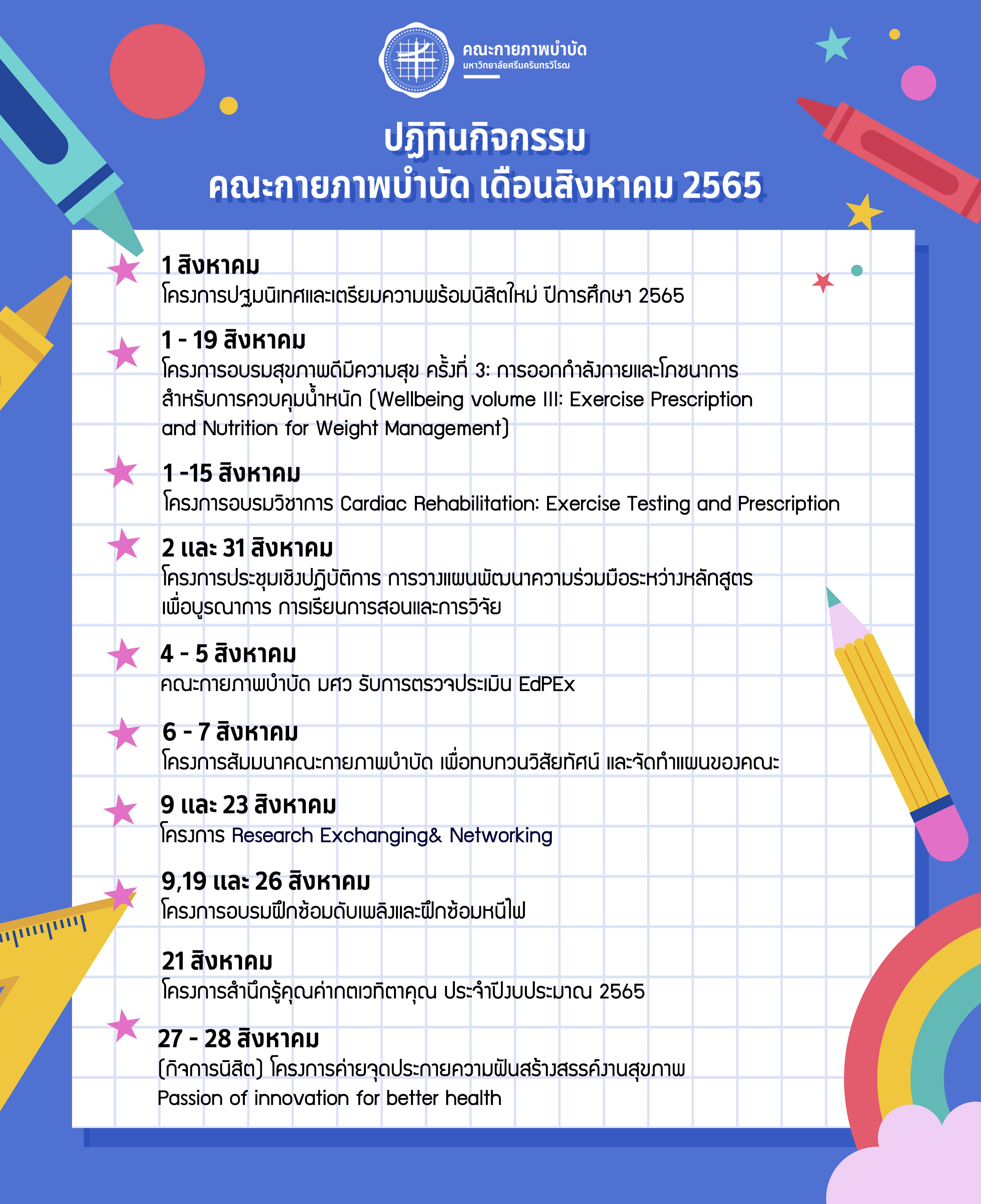 ปฏิทินกิจกรรม/โครงการ คณะกายภาพบำบัด มศว เดือนสิงหาคม 2565