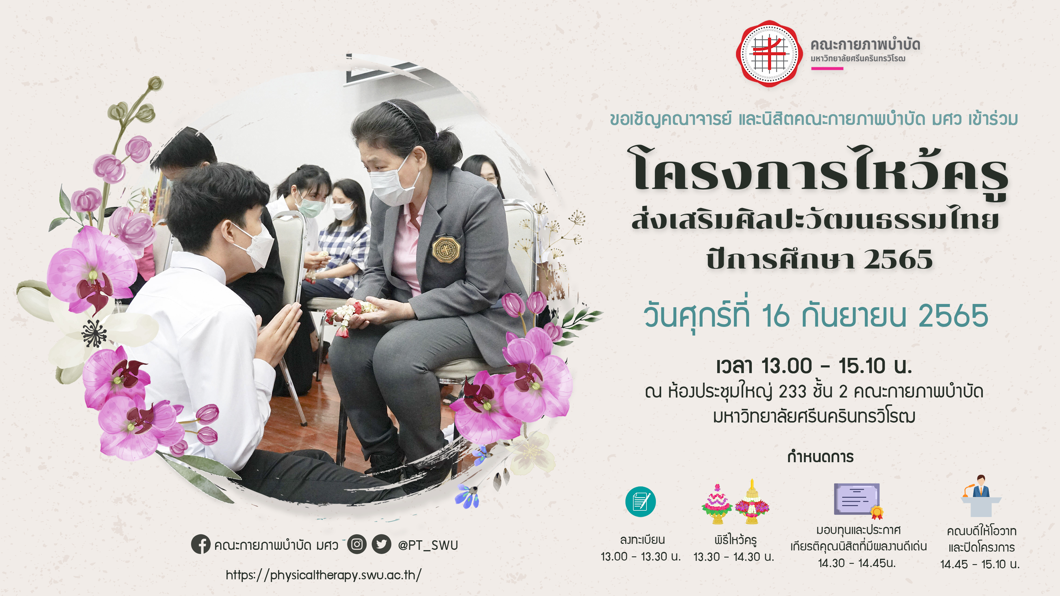News ขอเชิญผู้บริหาร คณาจารย์ และนิสิตคณะกายภาพบำบัด มศว เข้าร่วมโครงการไหว้ครู ส่งเสริมศิลปวัฒนธรรมไทย ปีการศึกษา 2565 ในวันศุกร์ที่ 16 กันยายน 2565 เวลา 13.00-15.10 น. ณ ห้องประชุมใหญ่ 233 ชั้น 2 คณะกายภาพบำบัด มหาวิทยาลัยศรีนครินทรวิโรฒ วันเริ่ม 2022-09-12