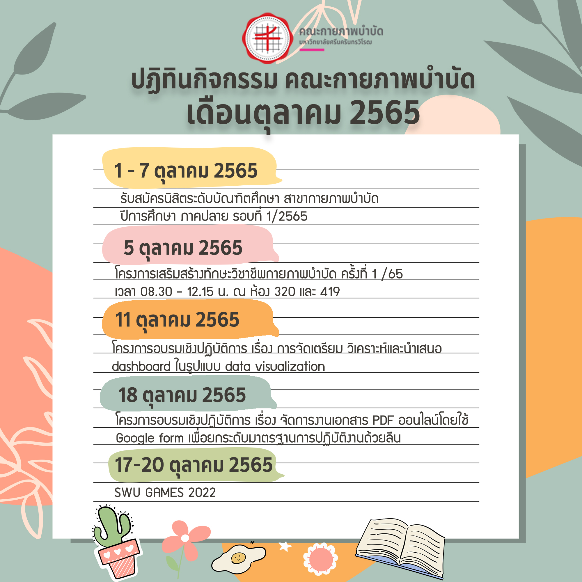 ปฏิทินกิจกรรม/โครงการ คณะกายภาพบำบัด ประจำเดือน ตุลาคม 2565