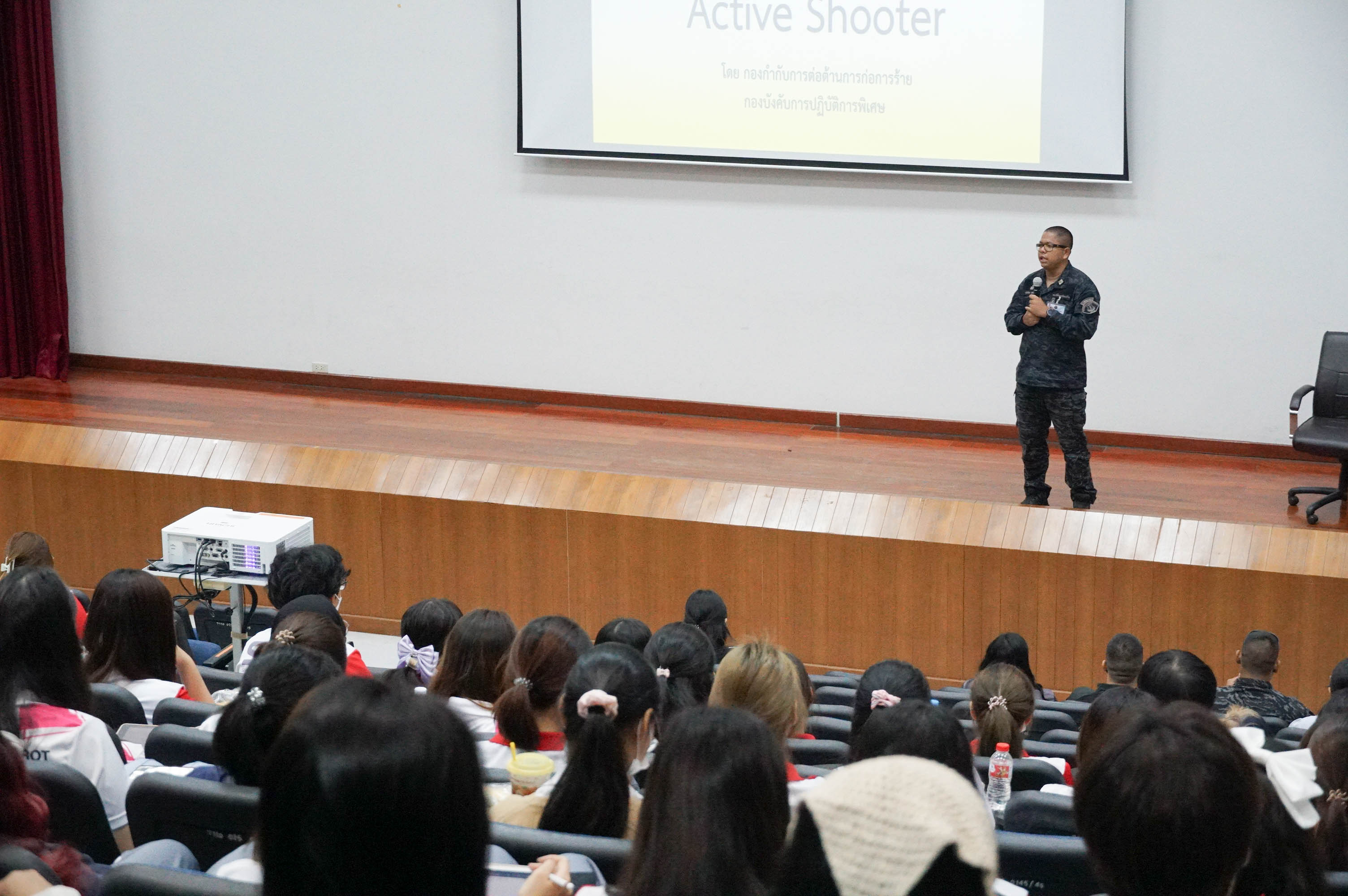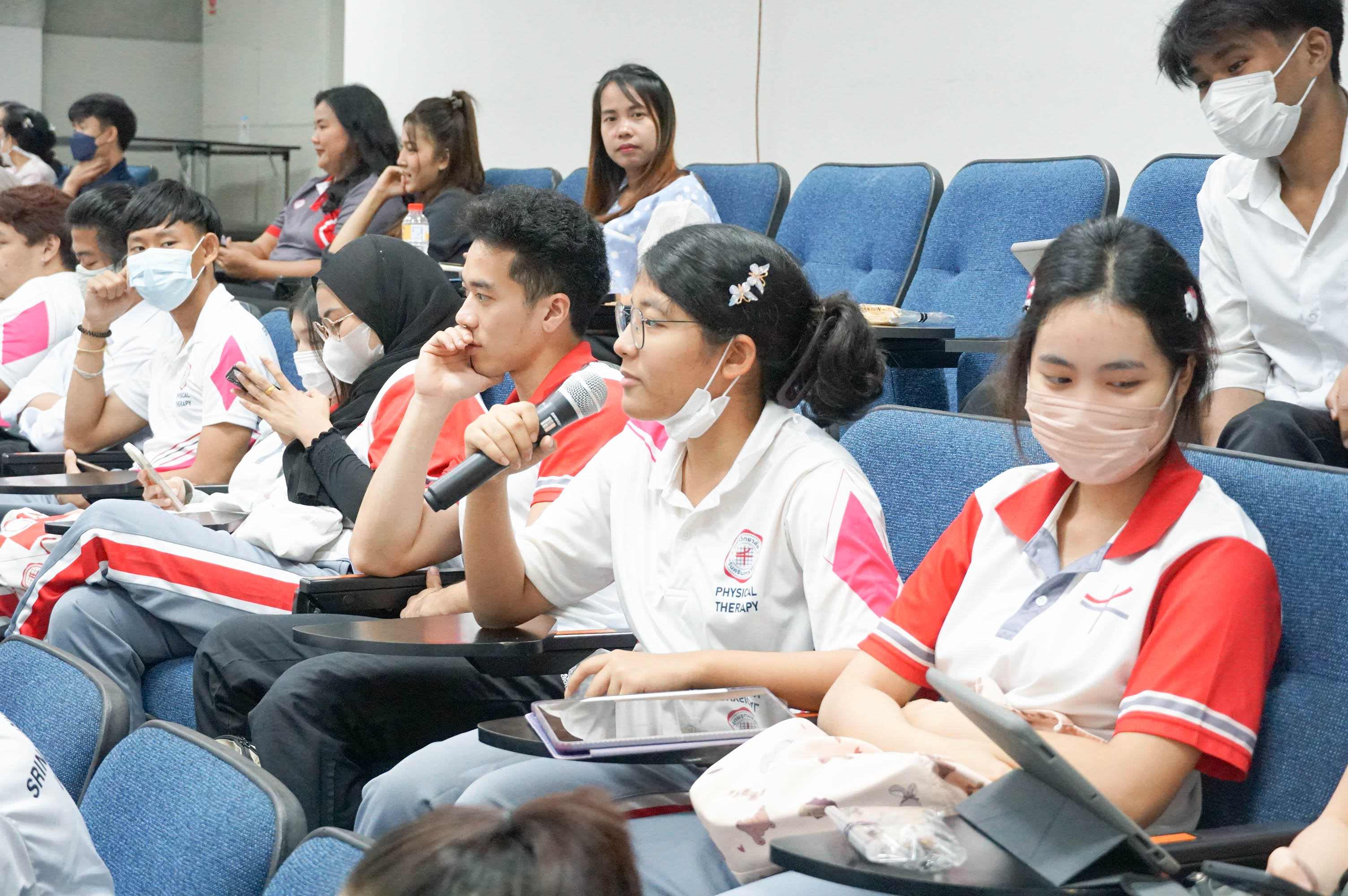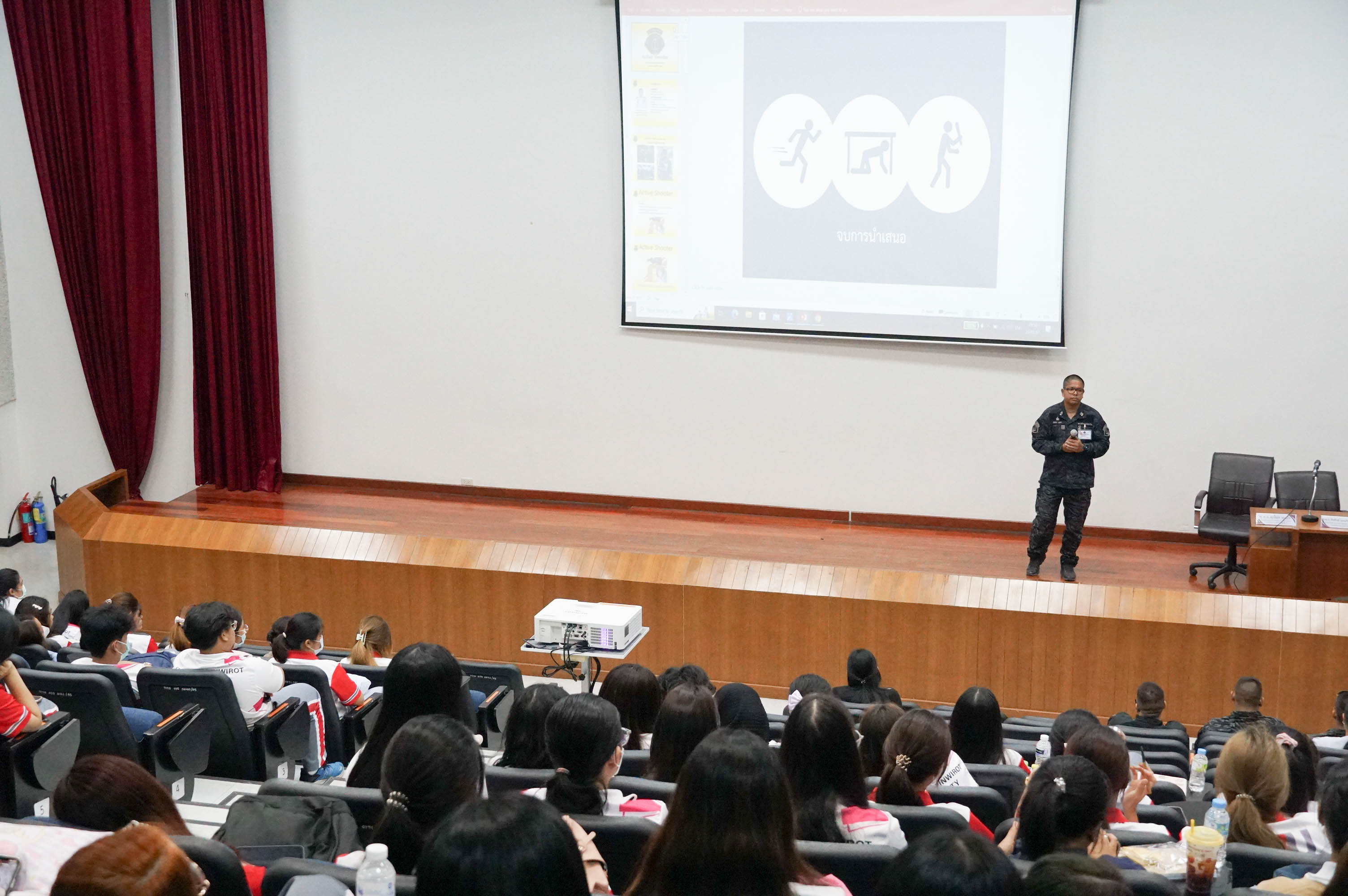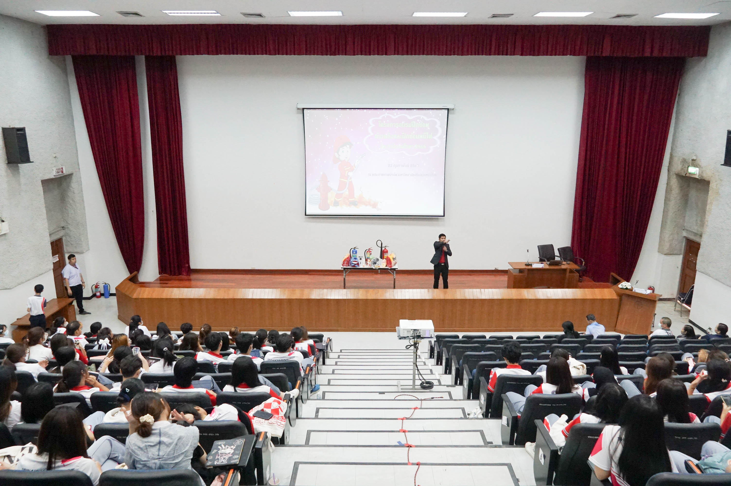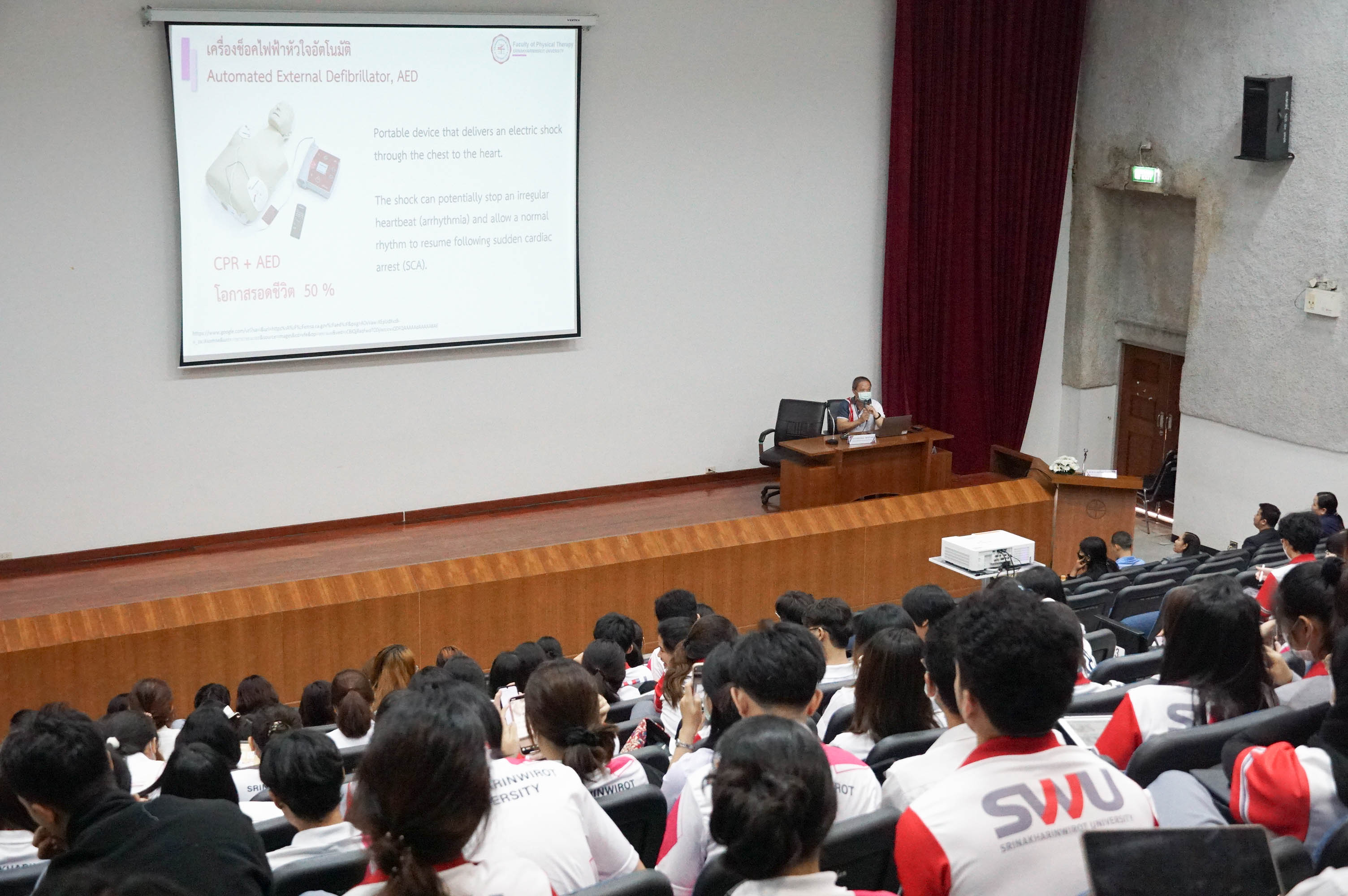 คณะกายภาพบำบัด มศว จัดโครงการอบรมฝึกซ้อมดับเพลิง และฝึกซ้อมหนีไฟ ประจำปี 2567 ณ ห้องประชุมใหญ่ และอาคารคณะกายภาพบำบัด โดยมี อ.ดร.สุรศักดิ์ อยู่ยงสะถิต อาจารย์สังกัดคณะแพทยศาสตร์ มศว เป็นวิทยากรบรรยาย และจัดกิจกรรมฝึกซ้อมหนีไฟโดยใช้เส้นทางหนีไฟภายในคณะ การบรรยายหัวข้อ การใช้เครื่องช่วยชีวิต AED โดยอ.สุวัฒน์ จิตรดำรงค์ รองคณบดีฝ่ายบริหาร และการบรรยายหัวข้อ การรับมือเหตุคนร้ายกราดยิงในที่สาธารณะ โดย พ.ต.ต.ศุภโชค พูลบัว สารวัตรกองกำกับการต่อต้านการก่อการร้าย กองบังคับการปฏิบัติการพิเศษ โดยกิจกรรมทั้งหมดนี้มีวัตถุประสงค์เพื่อเตรียมความพร้อมในการจัดการกับเหตุการณ์ฉุกเฉินที่อาจเกิดขึ้น เพื่อให้บุคลากรและนิสิตทราบถึงหน้าที่ของตนเอง เมื่อเกิดเหตุการณ์ฉุกเฉิน และปฏิบัติตนได้อย่างถูกต้องตามแผนการฝึกซ้อม