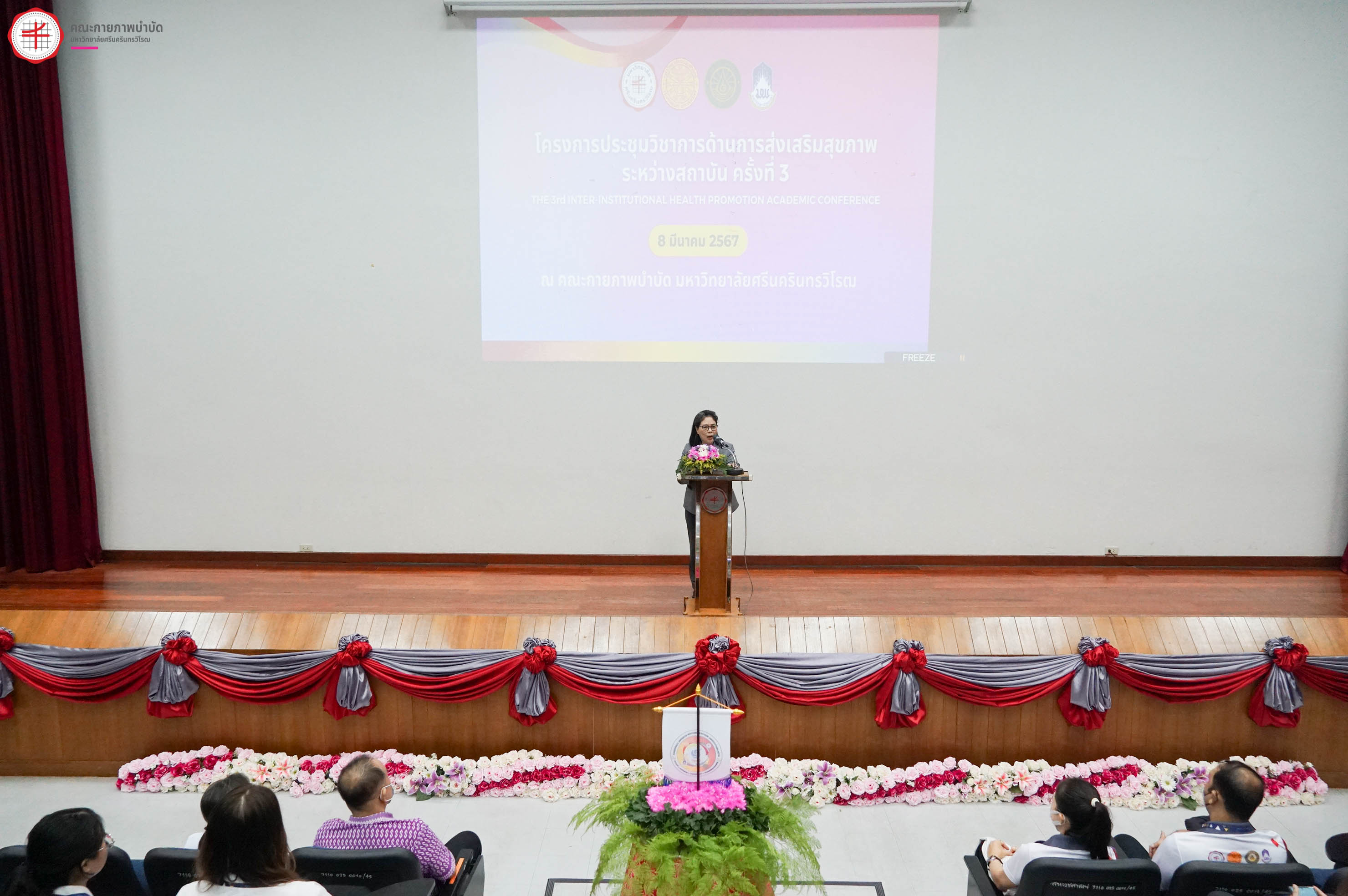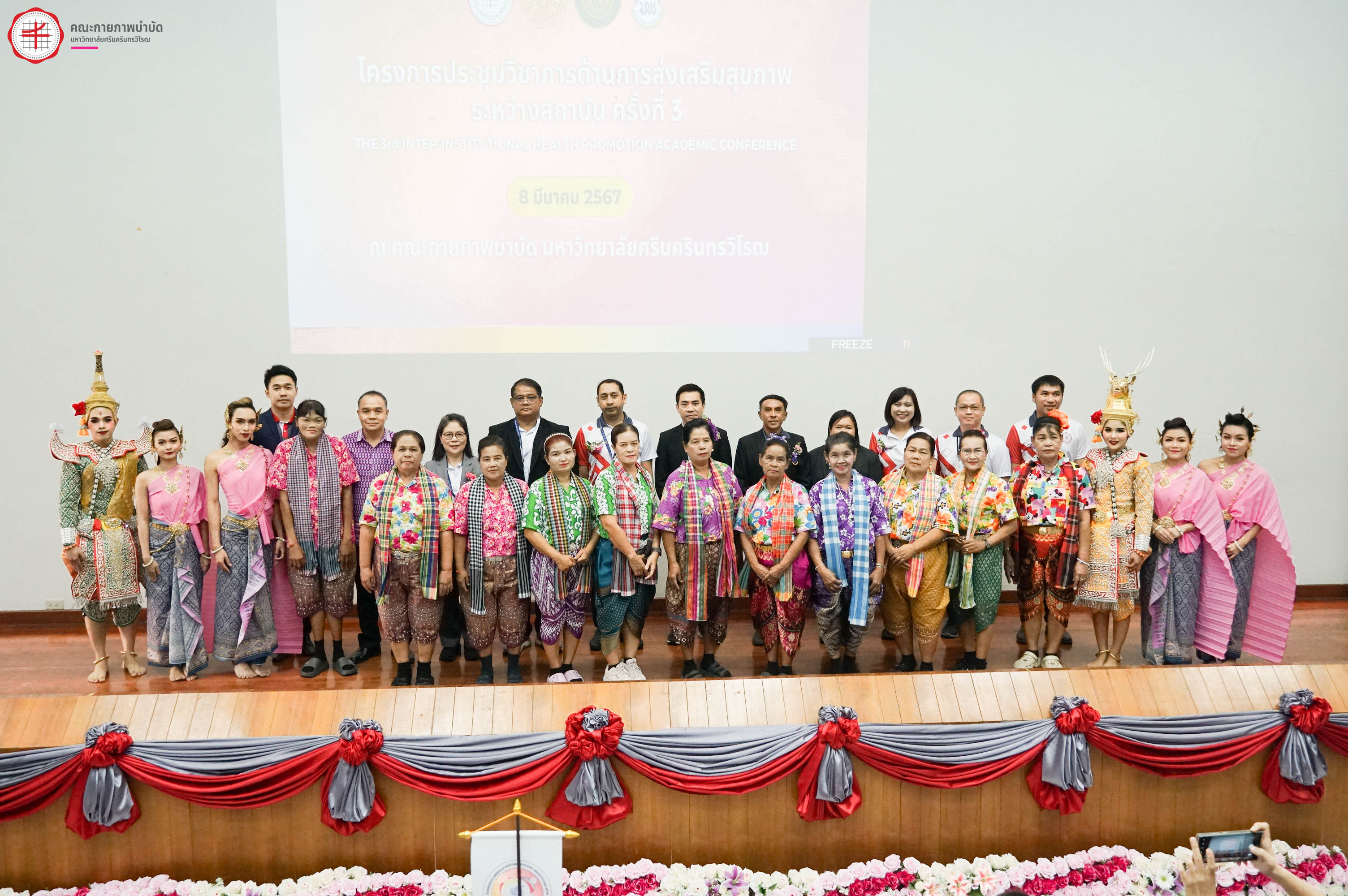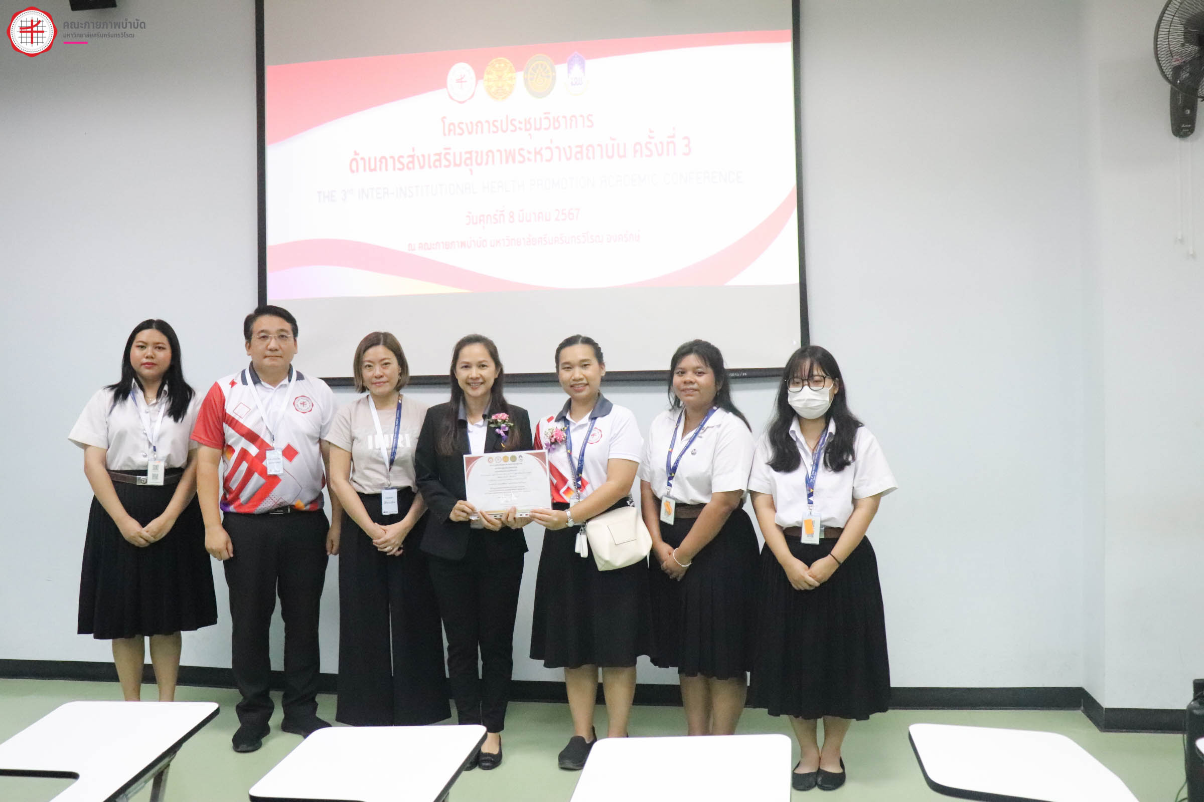 สาขาการส่งเสริมสุขภาพ คณะกายภาพบำบัด มหาวิทยาลัยศรีนครินทรวิโรฒ ร่วมกับสาขาการสร้างเสริมสุขภาพเชิงนวัตกรรม คณะสาธารณสุขศาสตร์ มหาวิทยาลัยธรรมศาสตร์ สาขาวิชาสุขศึกษาและการส่งเสริมสุขภาพ คณะสาธารณสุขศาสตร์ มหาวิทยาลัยบูรพา และสาขาการส่งเสริมสุขภาพ คณะสาธารณสุขศาสตร์ มหาวิทยาลัยพะเยา จัดโครงการประชุมวิชาการโดยมีวัตถุประสงค์เพื่อเปิดโอกาสให้นิสิต-นักศึกษา ได้เผยแพร่ผลงานวิจัย นวัตกรรม แลกเปลี่ยนเรียนรู้ ประสบการณ์วิจัย นวัตกรรมและสร้างเครือข่ายการส่งเสริมสุขภาพระหว่างสถาบันที่ผลิตบัณฑิตด้านการส่งเสริมสุขภาพร่วมกัน ภายใต้โครงการประชุมวิชาการด้านการส่งเสริมสุขภาพระหว่างสถาบัน ครั้งที่ 3 เมื่อวันศุกร์ที่ 8 มีนาคม 2567 ณ คณะกายภาพำบัด มหาวิทยาลัยศรีนครินทรวิโรฒ องครักษ์ โดยมีกิจกรรมบรรยายพิเศษ เรื่อง “นวัตกรรมการส่งเสริมสุขภาพอย่างยั่งยืนตามแนวคิด SDG” โดย ดร. ณัฐพันธุ์ ศุภกา ผู้อำนวยการสำนักพัฒนาภาคีสัมพันธ์และวิเทศสัมพันธ์และรักษาการผู้อำนวยการ สํานักวิชาการและนวัตกรรม สสส. และบรรยายพิเศษ หัวข้อ "วิธีคิดและแนวทางการสร้างสรรค์นวัตกรรมการบริการสุขภาพกับกลุ่มประชากรที่หลากหลาย" โดย ศาสตราจารย์กิตติคุณ ประพันธ์ ภานุภาค ปรึกษาอาวุโส ด้านการวิจัยและนโยบายสาธารณะ สถาบันเพื่อการวิจัยและนวัตกรรมด้านเอชไอวี (IHRI, Institute of HIV Research and Innovation) - ที่ปรึกษา ศูนย์ประสานความร่วมมือระหว่างไทย ออสเตรเลีย เนเธอร์แลนด์เพื่อการศึกษาวิจัยทางคลินิกด้านโรคเอดส์ (HIV-NAT) และกิจกรรมการนำเสนอผลงานของนิสิต-นักศึกษา ในรูปแบบ Oral Presentation และ Poster Presentation