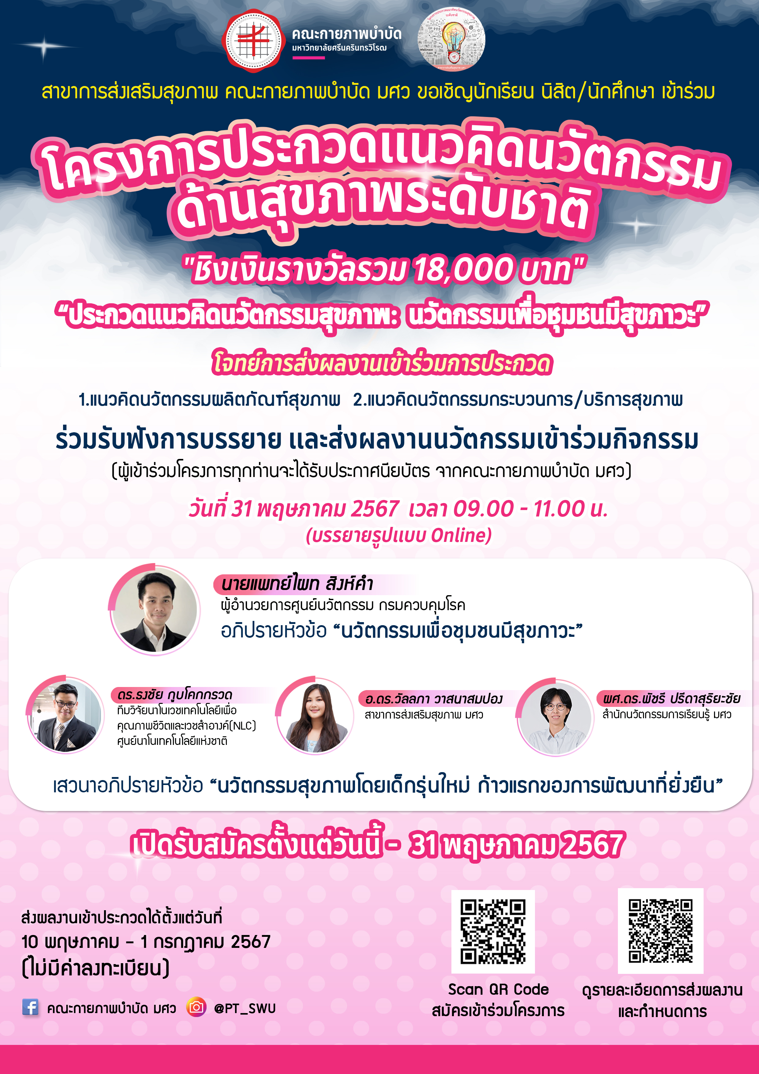 สาขาการส่งเสริมสุขภาพ คณะกายภาพบำบัด มศว ขอเชิญนักเรียน นิสิต/นักศึกษา เข้าร่วมโครงการประกวดแนวคิดนวัตกรรมด้านสุขภาพระดับชาติ