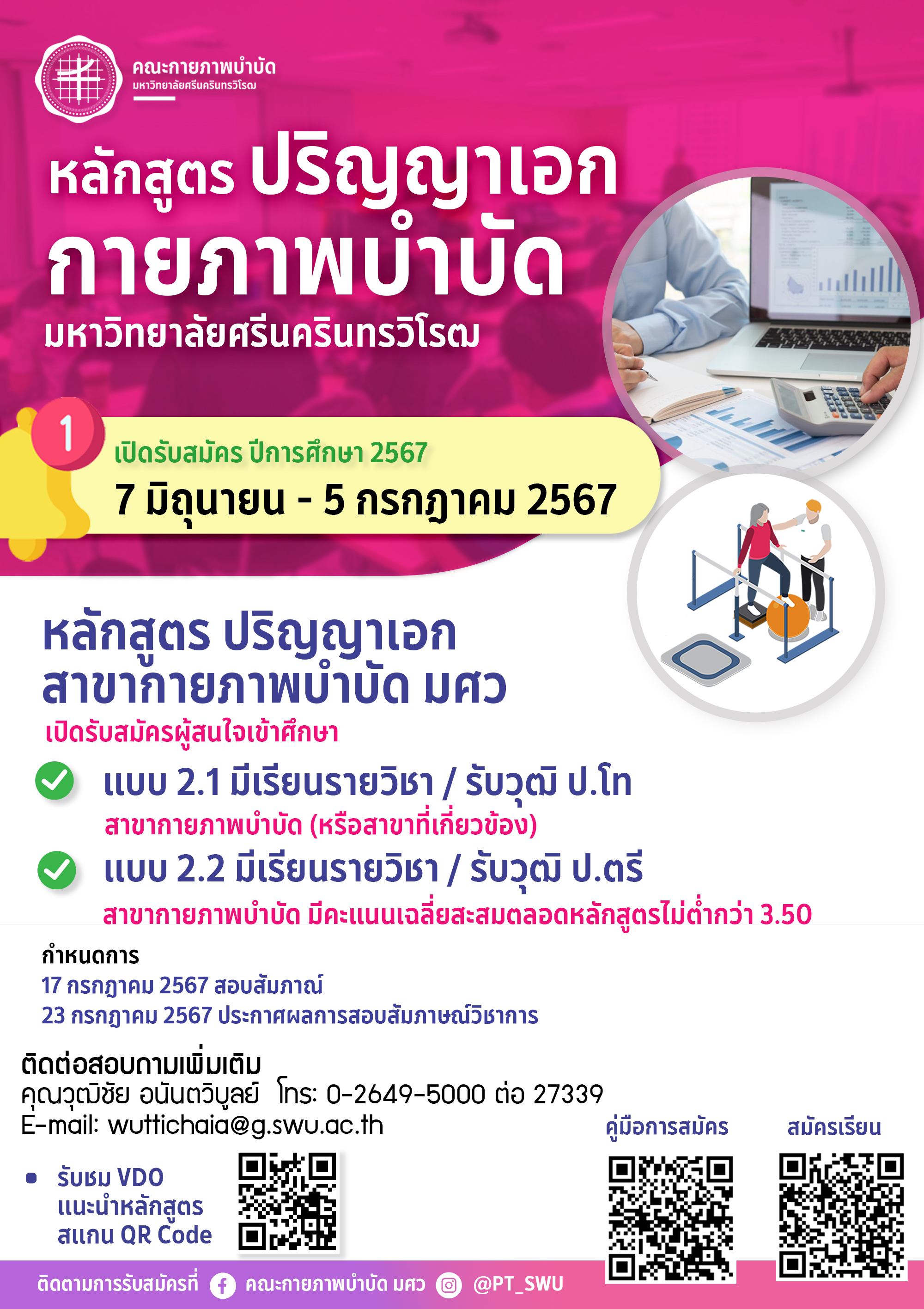 ข่าวประชาสัมพันธ์ [รับสมัครระดับบัณฑิตศึกษา]หลักสูตรปริญญาเอก สาขากายภาพบำบัด มหาวิทยาลัยศรีนครินทรวิโรฒ“หลักสูตรปรับปรุงใหม่” ปีการศึกษา 2567เปิดรับสมัคร 7 มิถุนายน - 5 กรกฎาคม 2567 เพิ่มทักษะการจัดการธุรกิจกายภาพบำบัดและสุขภาพ เรียนไปด้วย ทำงานไปด้วย ไม่ต้องลาออกจากงานประจำ ได้เรียนกับอาจารย์ชั้นนำจากต่างประเทศติดต่อสอบถามเพิ่มเติมคุณวุฒิชัย อนันตวิบูลย์ โทร: 0-2649-5000 ต่อ 27339E-mail: wuttichaia@g.swu.ac.thสมัครได้ที่ https://admission.swu.ac.th/admissions2/graduate.php.คู่มือการสมัคร .รับชม VDO รีวิวหลักสูตรบัณฑิตศึกษา>> https://www.youtube.com/watch?v=1ZhExMsbm-M #เรียนต่อ #ปริญญาโทกายภาพบำบัด #ปริญญาเอก#กายภาพบำบัด #นักกายภาพบำบัด#ทีมมศว #มศว วันเริ่ม 2024-06-07