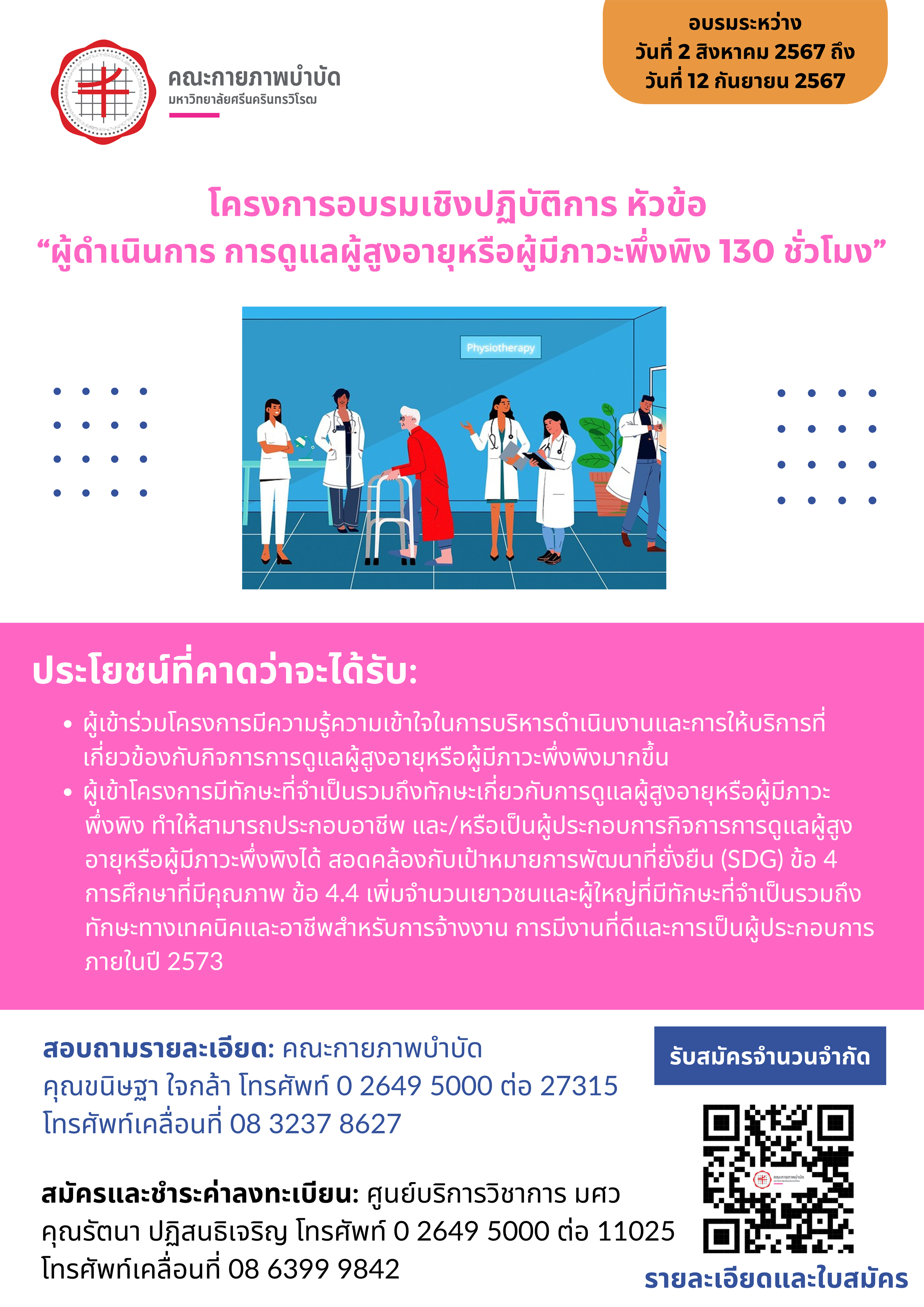 ขอเชิญผู้สนใจเข้าร่วมโครงการอบรมเชิงปฏิบัติการ หัวข้อ“ผู้ดําเนินการ การดูแลผู้สูงอายุหรือผู้มีภาวะพึ่งพิง 130 ชั่วโมง”