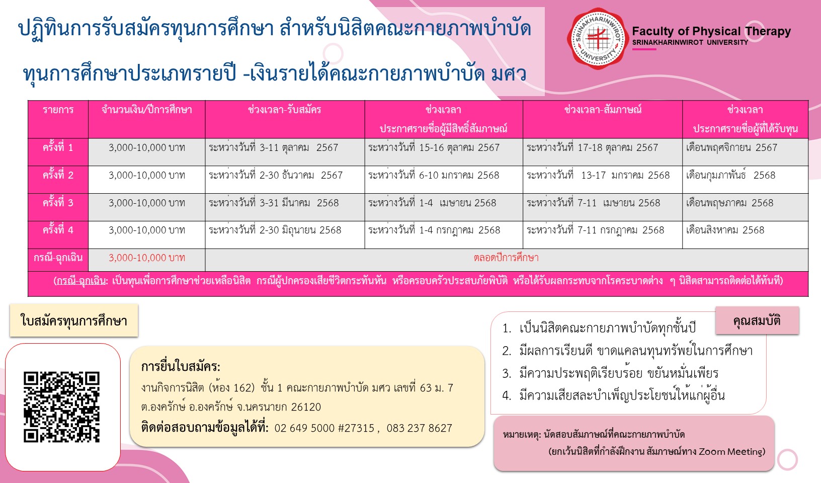 รับสมัครทุนการศึกษา ของคณะกายภาพบำบัด รับใบสมัครถึงวันที่ 11 ตุลาคม 2567
