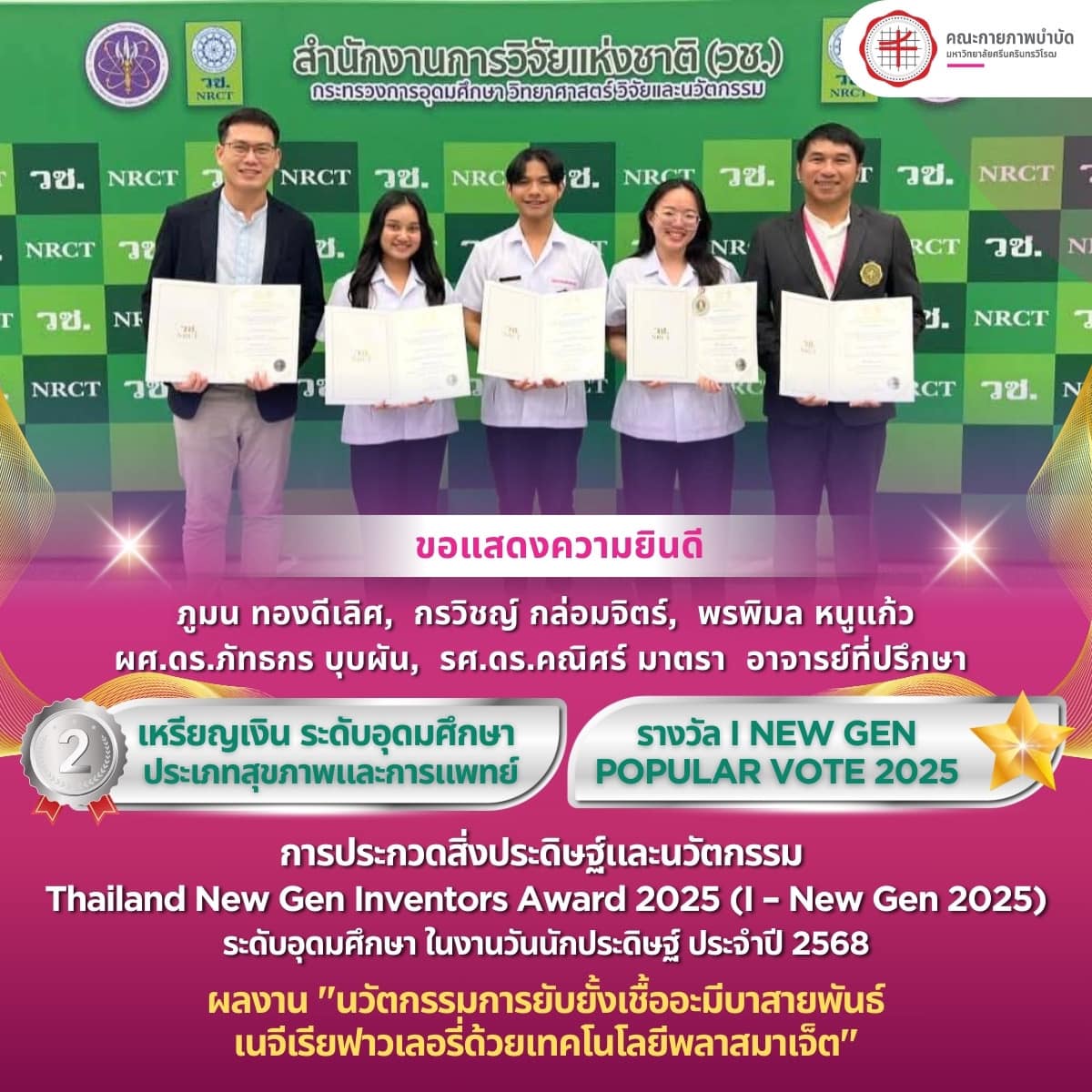 คณะกายภาพบำบัด มศว ขอแสดงความยินดีกับอาจารย์และนิสิต ที่ได้รับรางวัลการประกวดสิ่งประดิษฐ์และนวัตกรรม Thailand New Gen Inventors Award 2025 (I – New Gen 2025) ระดับอุดมศึกษาใน “งานวันนักประดิษฐ์” ประจำปี 2568 ระหว่างวันที่ 2 – 6 กุมภาพันธ์ 2568 ณ ศูนย์นิทรรศการและการประชุมไบเทค บางนา