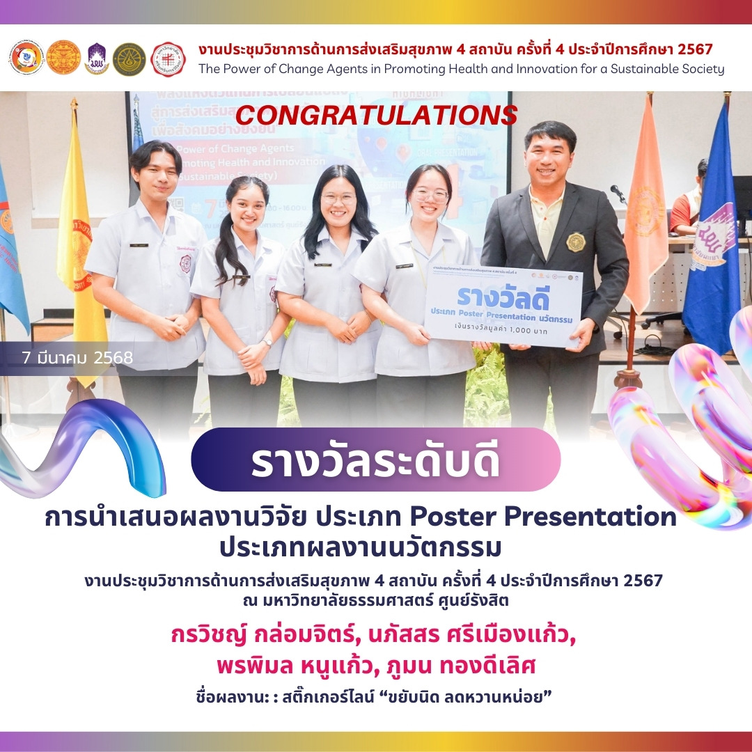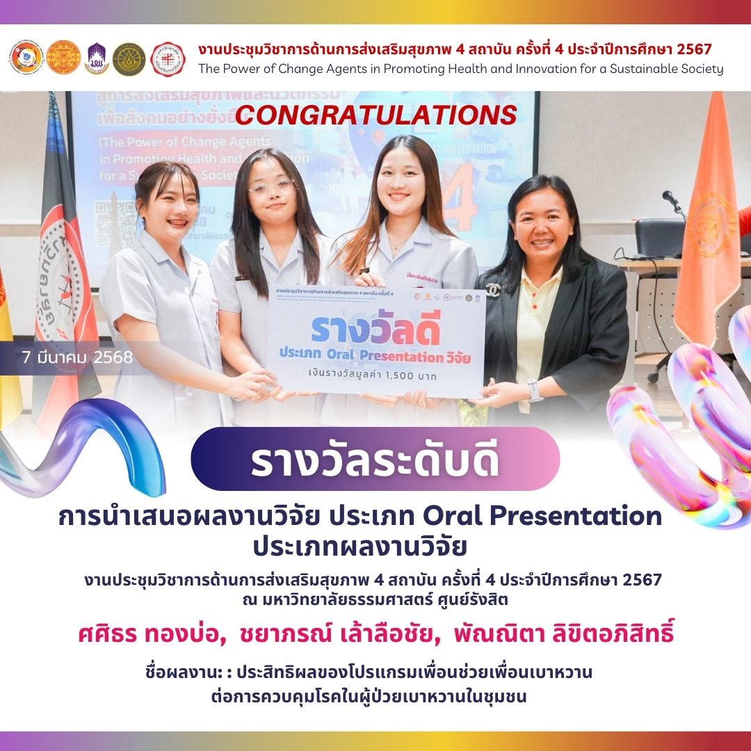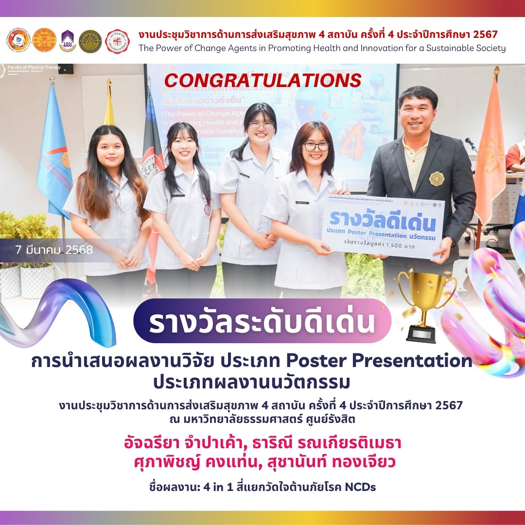 ยกทัพคว้า 6 รางวัล การนำเสนอผลงานวิจัย Oral & Poster Presentation "งานประชุมวิชาการด้านการส่งเสริมสุขภาพ 4 สถาบัน ครั้งที่ 4 ประจำปีการศึกษา 2567" (The Power of Change Agents in Promoting Health and Innovation for a Sustainable Society) ! 🚀🎓💡