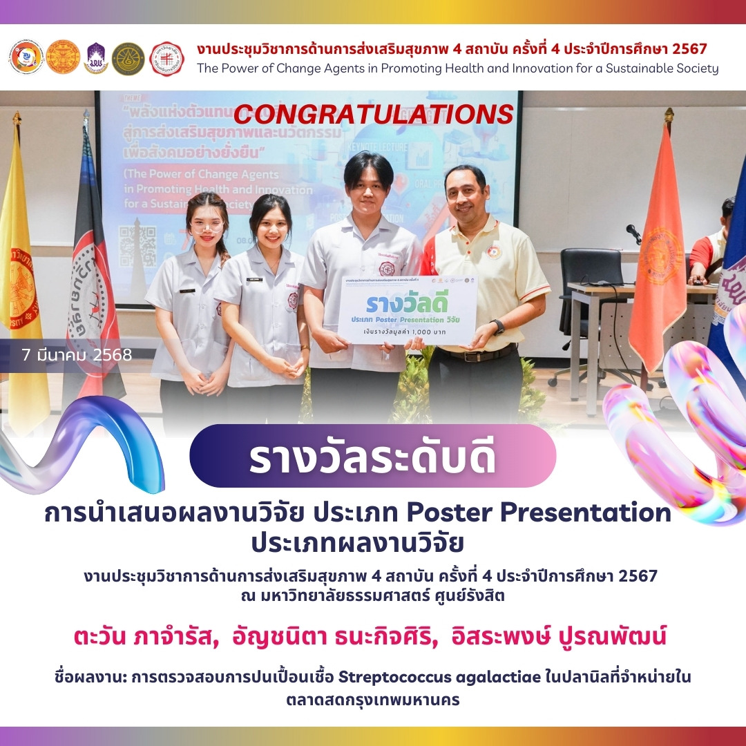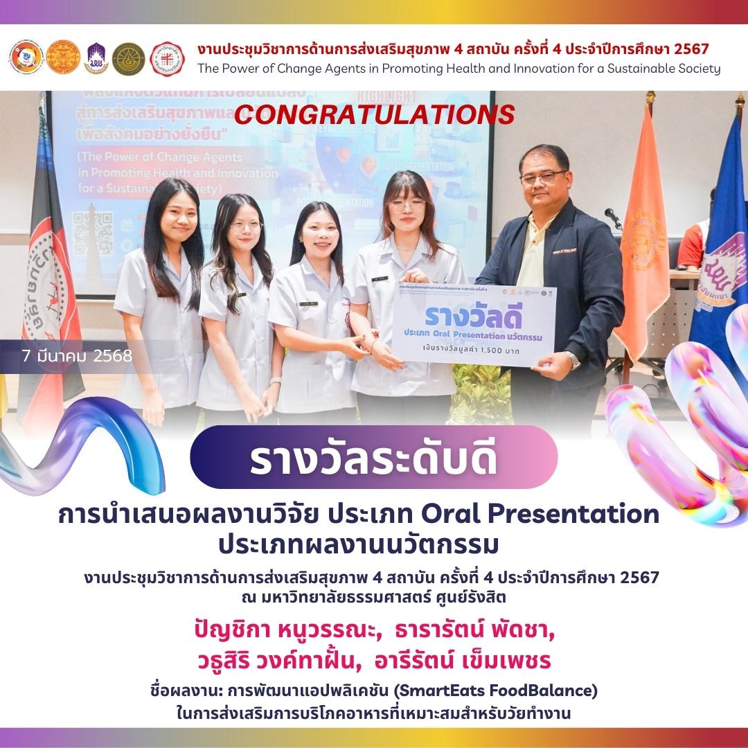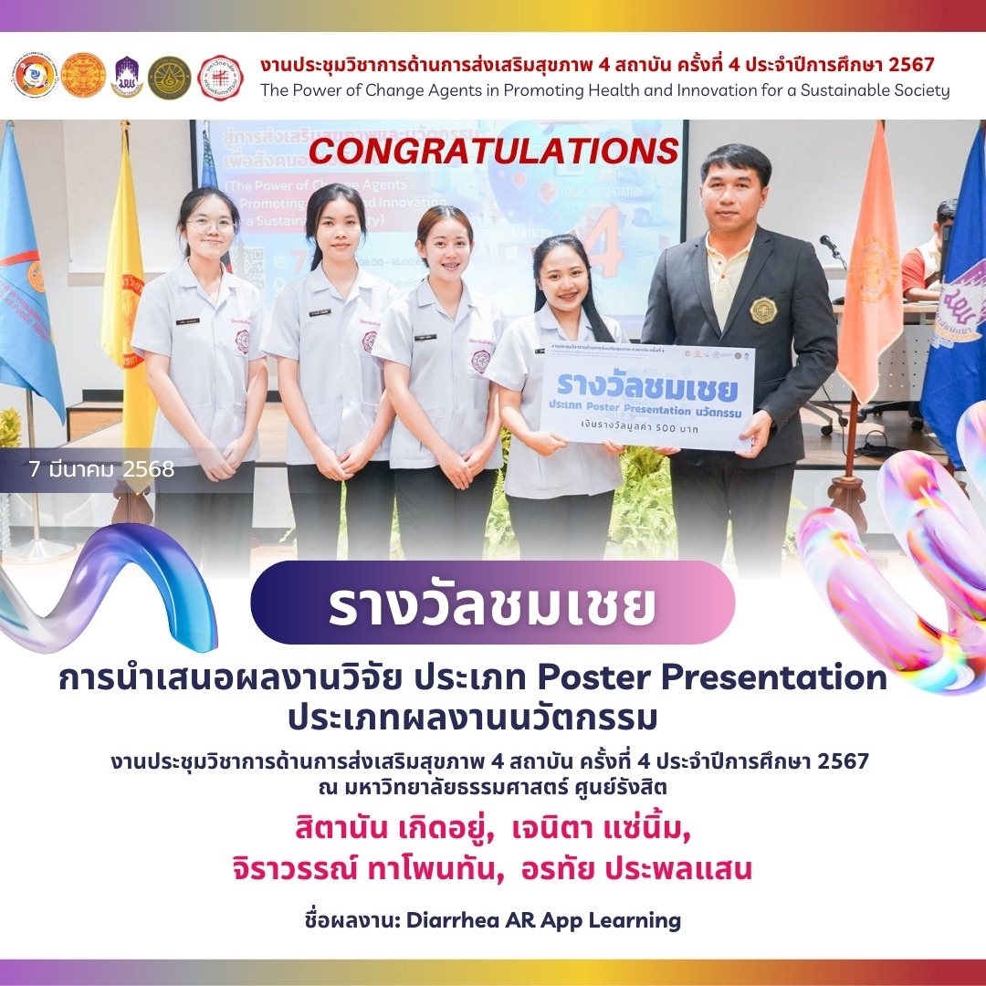 ยกทัพคว้า 6 รางวัล การนำเสนอผลงานวิจัย Oral & Poster Presentation "งานประชุมวิชาการด้านการส่งเสริมสุขภาพ 4 สถาบัน ครั้งที่ 4 ประจำปีการศึกษา 2567" (The Power of Change Agents in Promoting Health and Innovation for a Sustainable Society) ! 🚀🎓💡