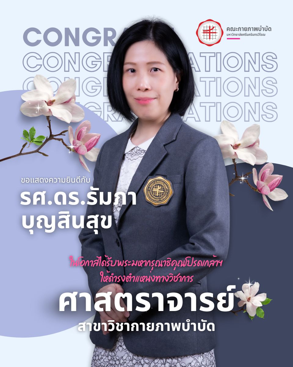 ข่าวประชาสัมพันธ์ คณะกายภาพบำบัด มศว ขอแสดงความยินดีกับรองศาสตราจารย์ ดร.รัมภา บุญสินสุขในโอกาสได้รับพระมหากรุณาธิคุณโปรดเกล้าฯให้ดำรงตำแหน่งทางวิชาการ "ศาสตราจารย์"สาขาวิชากายภาพบำบัด วันเริ่ม 2025-12-03