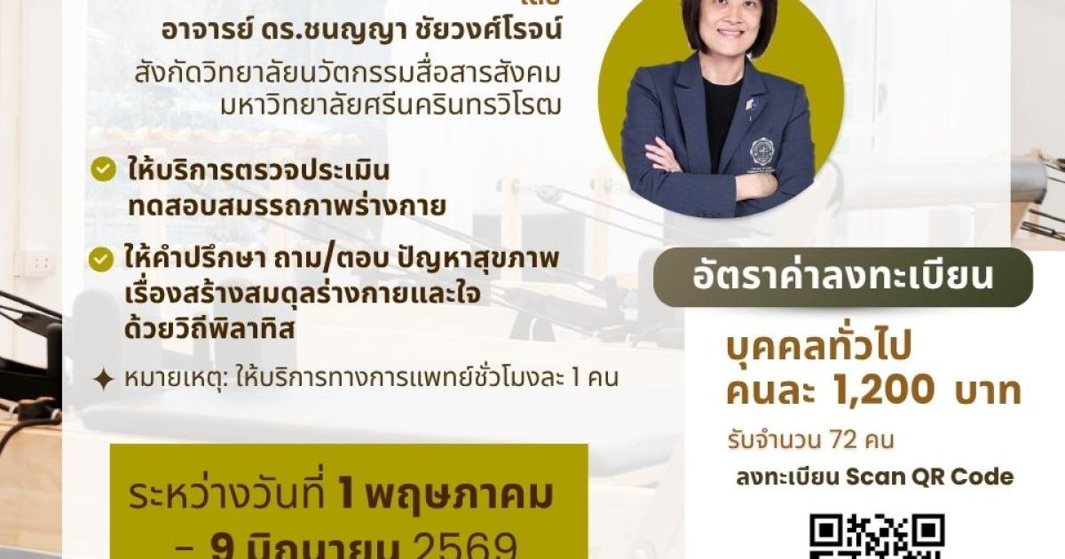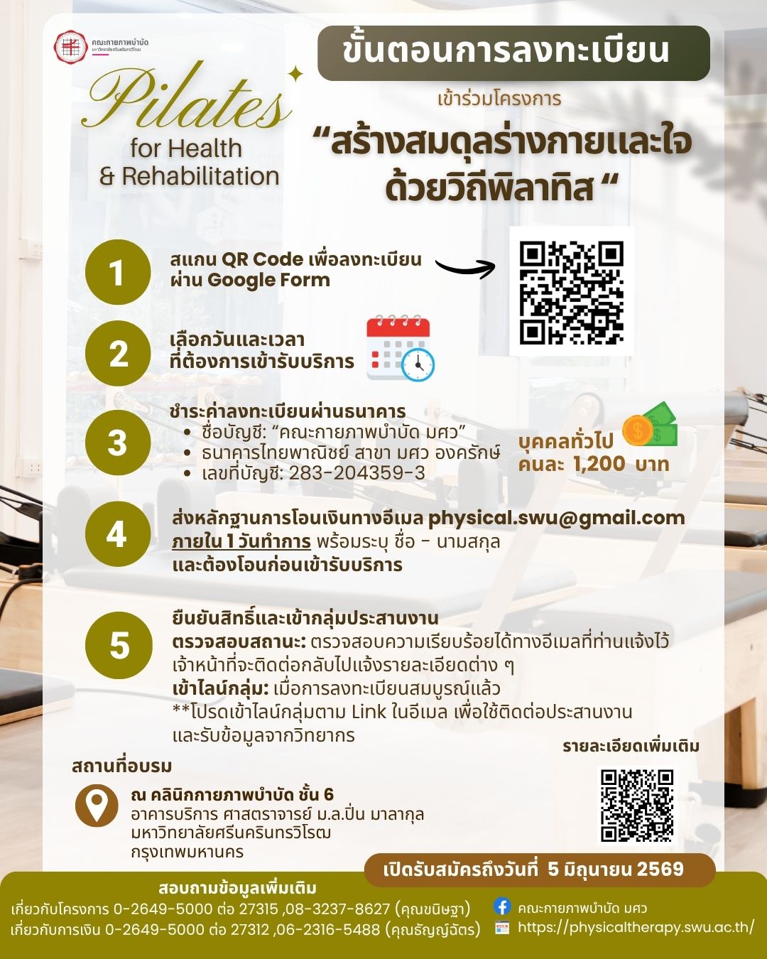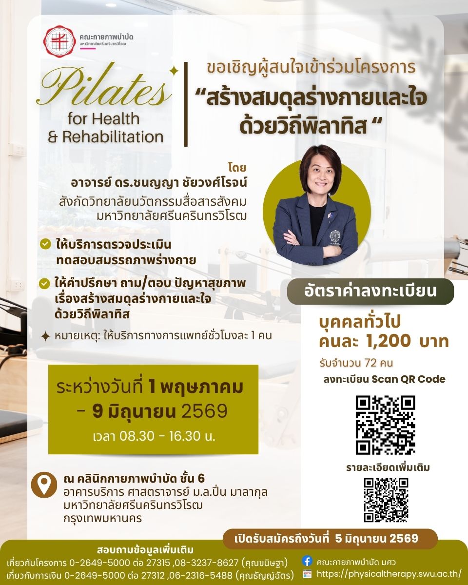 ขอเชิญผู้สนใจเข้าร่วมโครงการ "สร้างสมดุลร่างกายและใจ ด้วยวิถีพิลาทิส"
