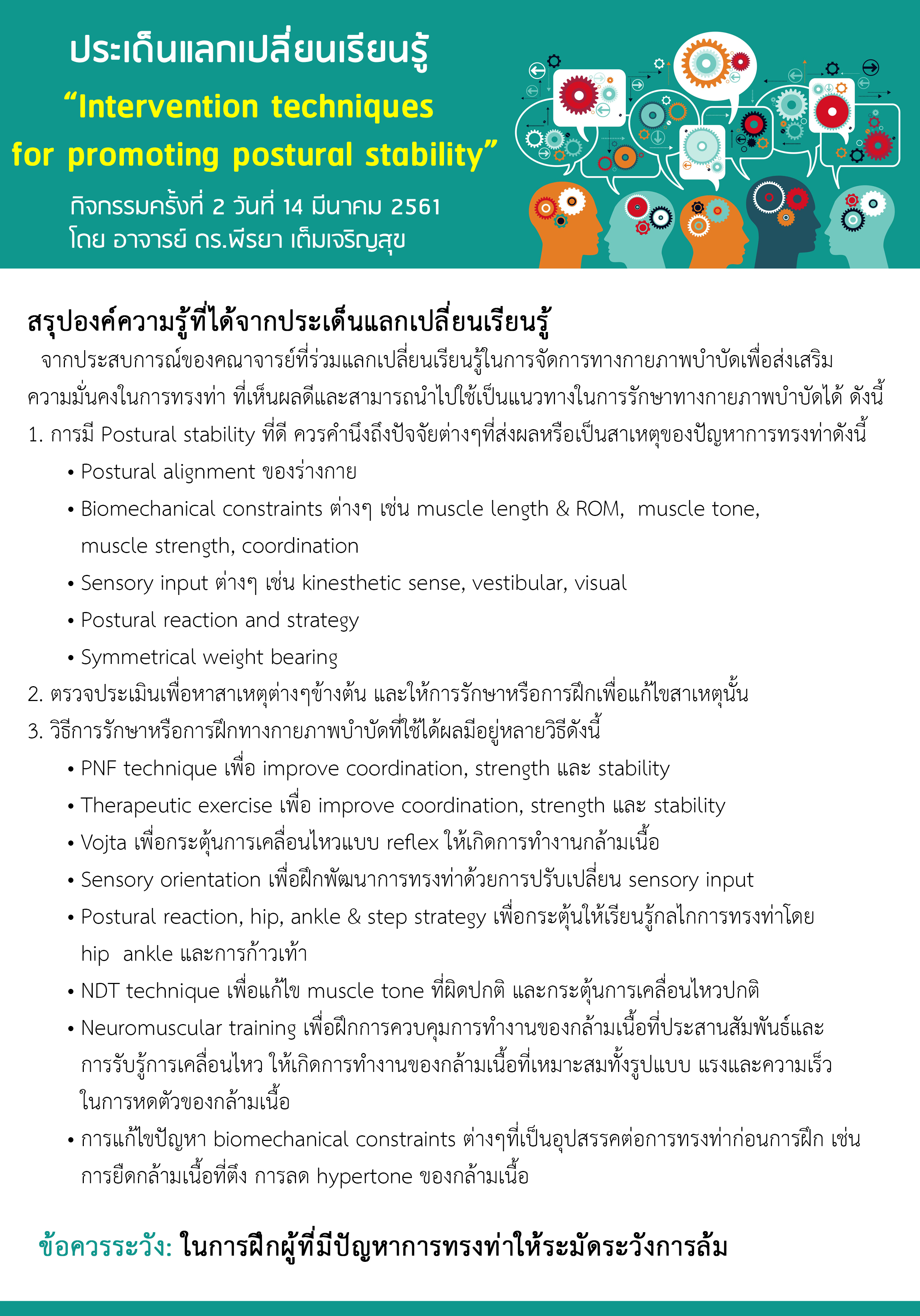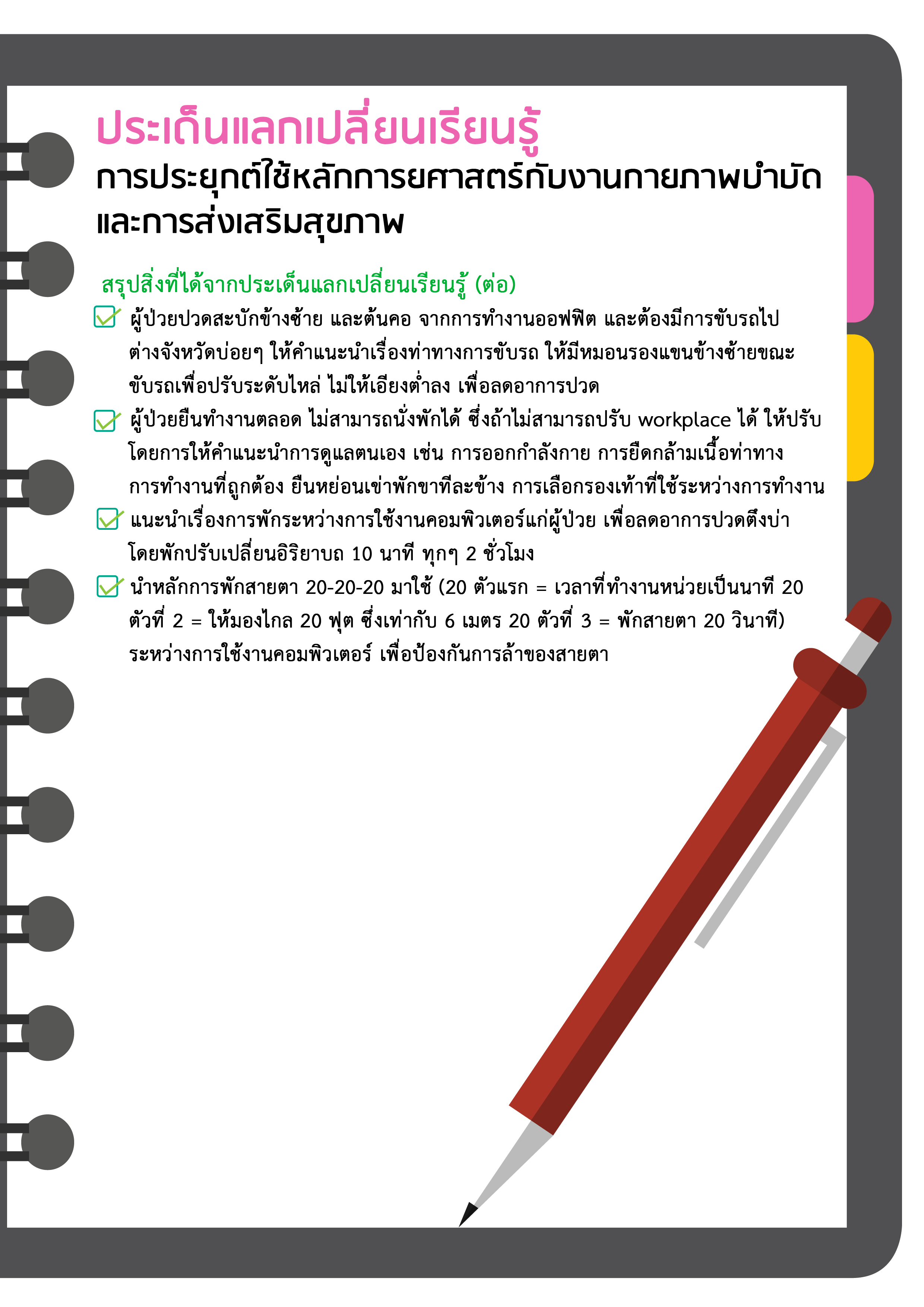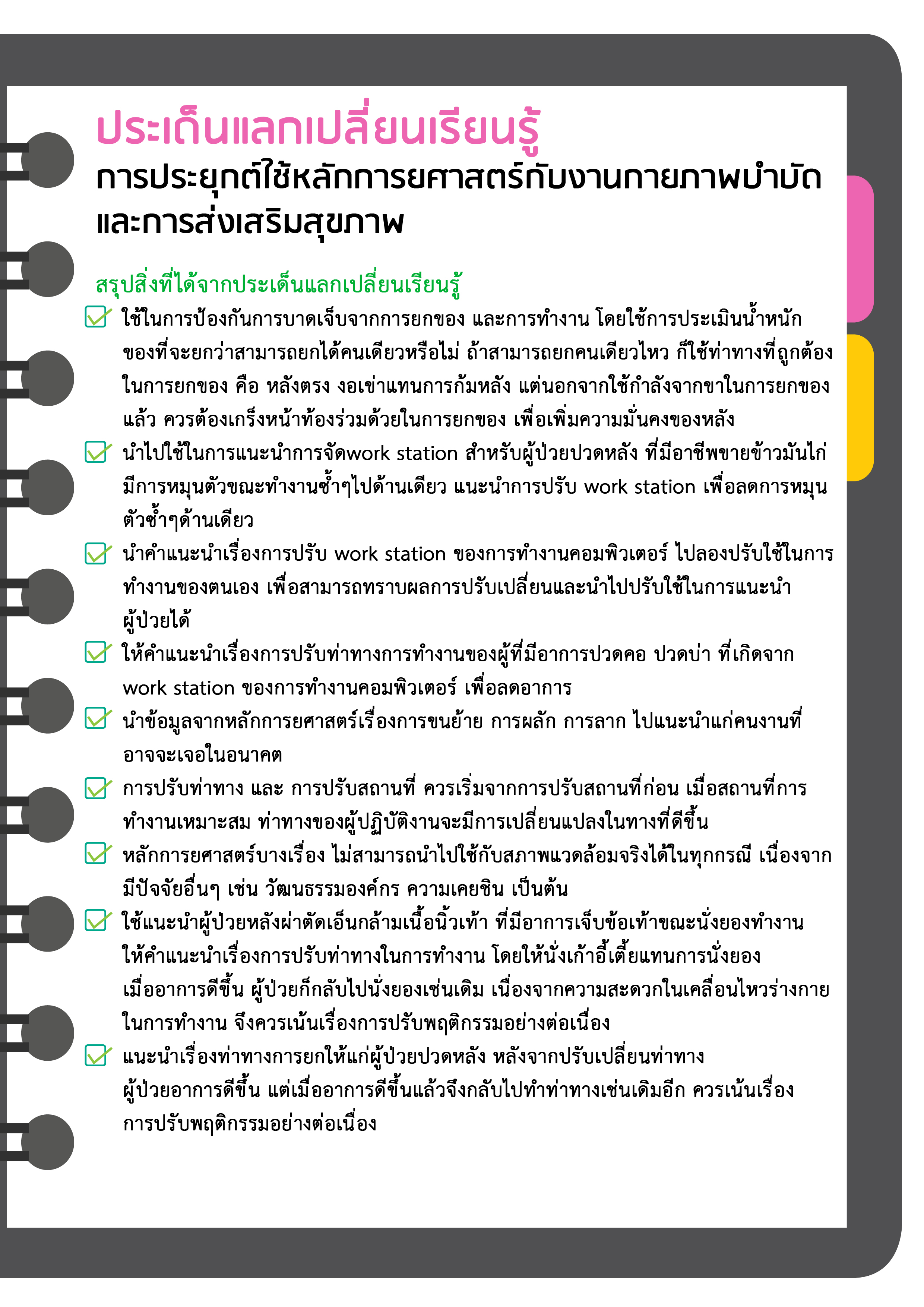หัวข้อ ความรู้และทักษะที่ได้รับจากการเข้าร่วมอบรมเชิงปฏิบัติการเรื่อง การประยุกต์ใช้หลักการยศาสตร์กับงานกายภาพบำบัดและการส่งเสริมสุขภาพ วิทยากรโดย อ.ดร.อรวรรณ เยี่ยมพัฒนพร