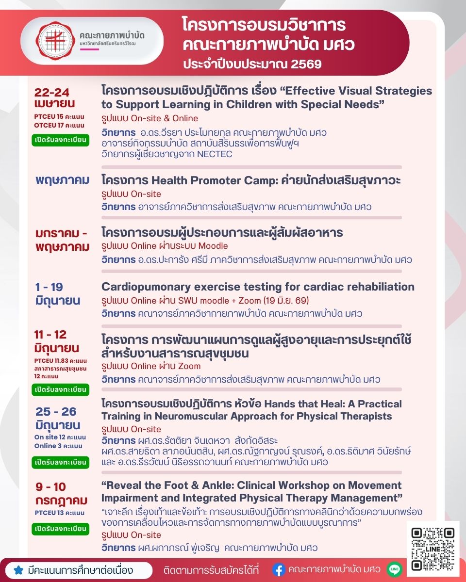โครงการอบรมวิชาการ คณะกายภาพบำบัด มศว ประจำปีงบประมาณ 2568คณะกายภาพบำบัด มศว มีการจัดอบรมวิชาการในสาขากายภาพบำบัด และการส่งเสริมสุขภาพ…